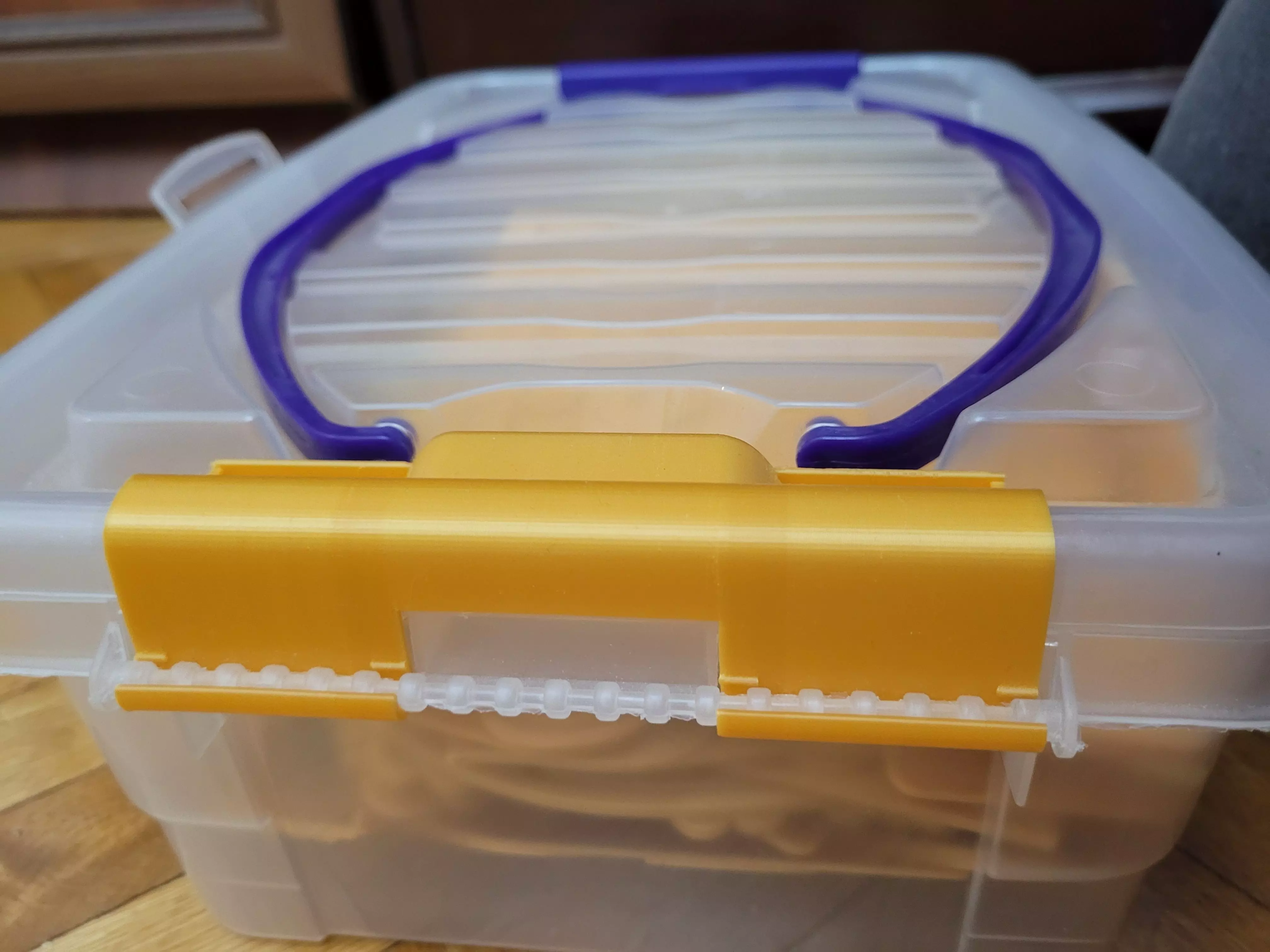 A functional 3D-printable replacement latch designed to repair broken snaps on large plastic storage containers. Restores secure lid closure and original container usability.