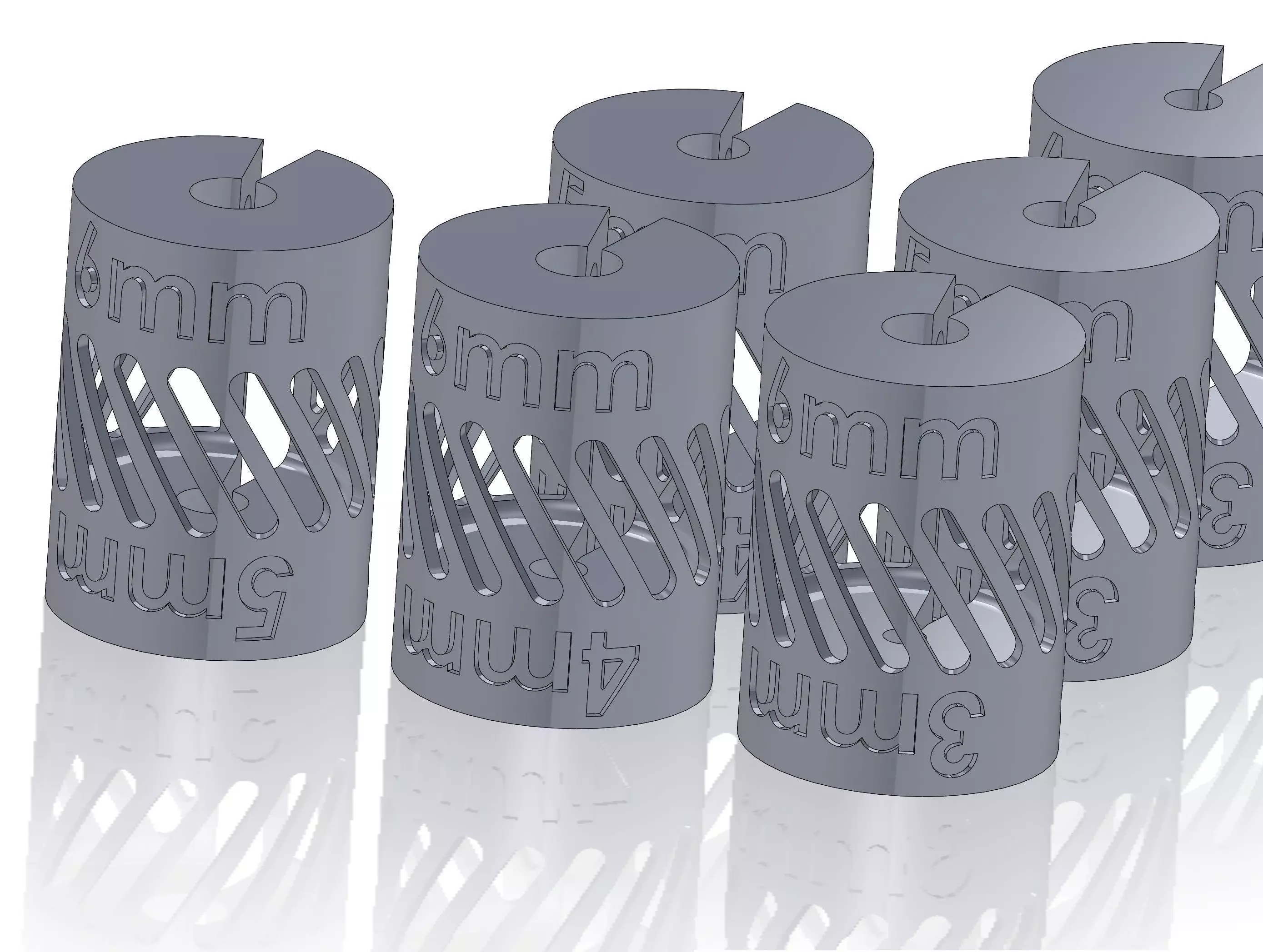 File: Shaft Couplings Reducers.STLName: Shaft Coupling - Metric - ReducersMaterial: 27 grams ( 0.06 lbs) Infill = 12%Size: 72.56 mm (2.857") x 75.56 mm (2.857") x 30 mm (1.181")Resolution: 0.20mmLayers: 156 layers Rafts: Yes Supports: NoPrint Time: 3 hr 29 minFunction: Prints a set of six couplings to connect 3mm, 4mm, 5mm, and 6mm shafts together in any combination required. Each couple requires two M3 x 12 screws and M3 nuts to squeeze each end of the coupling to its shaft. If you don't need all six, simply print the size you need. These couplings will take a surprising amount of axial misalignment inclduing offset and angular. Each end of the coupling has the size engraved into the surface.