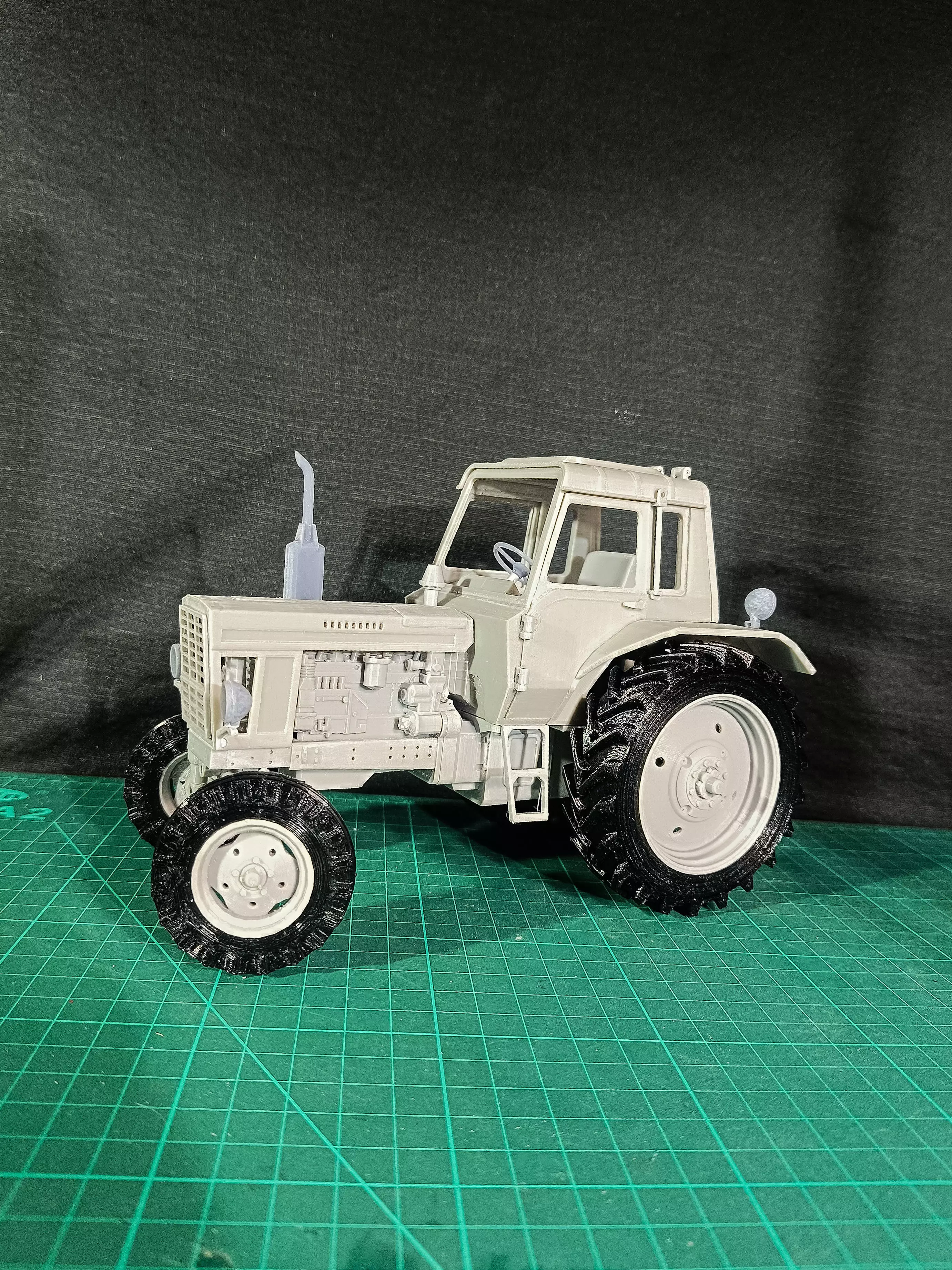 MTZ-80 tractor with a small (early) cab. The RC model is made in 18 scale, with a balancing front beam. Easy to print and assemble. A gasoline starter motor with a clutch is installed on the diesel engine. The electronics are located under the cabin, the cabin interior remains free, in the front part (under the hood) the electronics are also not visible, the servo is hidden in the internal combustion engine. There is a working attachment (the servo is located under the cabin). To save space, it is recommended to remove excess wires (servo, speed control, etc.). For more responsive control, it is recommended to insert a cast weight into the crankcase (the mold for its casting is available in the archive).