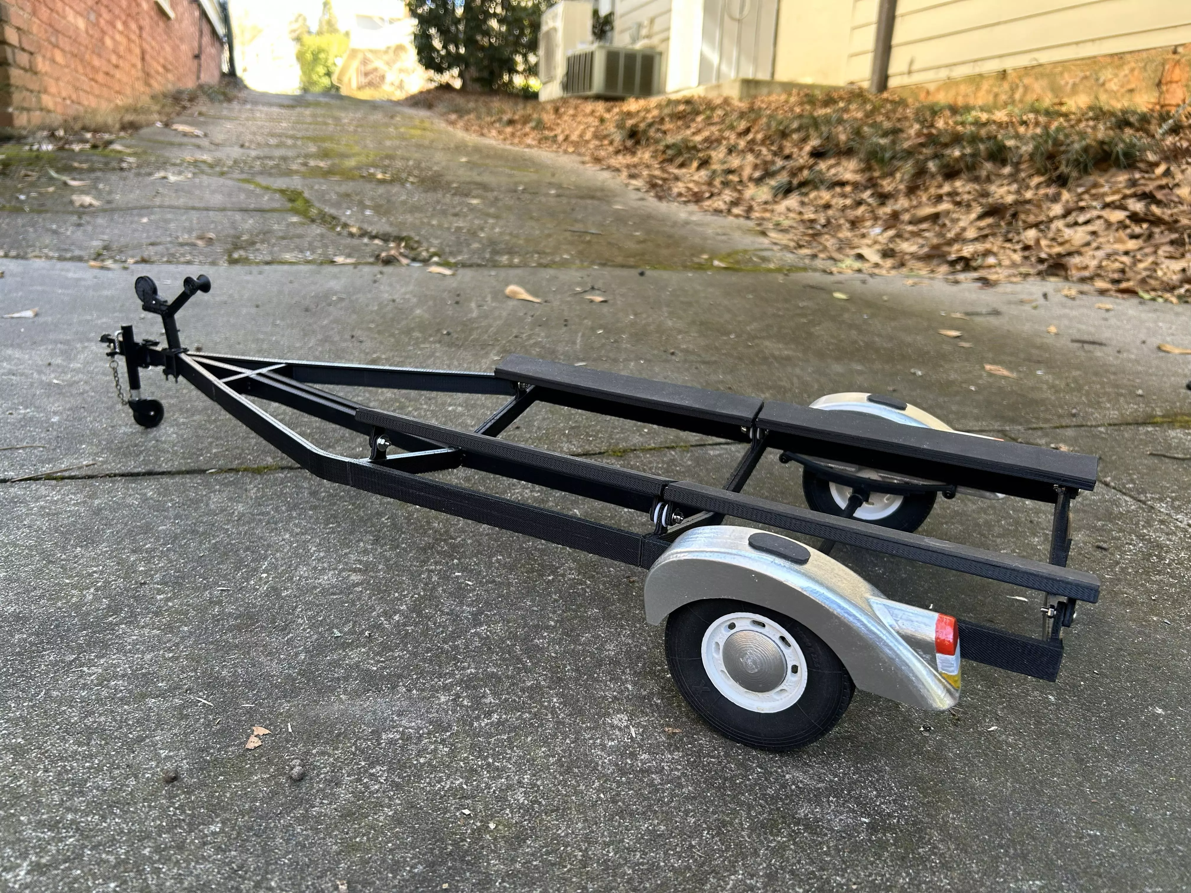 This boat trailer was designed to display all of my 1:8 scale boat models and can be adapted in look and functionality. The fenders and wheels, with radial tires, were designed to coordinate with the retro styling of the Chris Craft boats of the late 1950's. However, the trailer takes on a more modern look without the fenders. The boat support planks are fully adjustable to conform to hulls of different shapes and the come-along and jack can also be moved to adjust for overall length. The wheels do roll if you intend to pull the trailer and I have added an optional carbon support rod to the spine for additional support. If using for a car; the wheelbase should be 7". I have also included a step by step, photo illustarted, assembly guide with links to materials used.