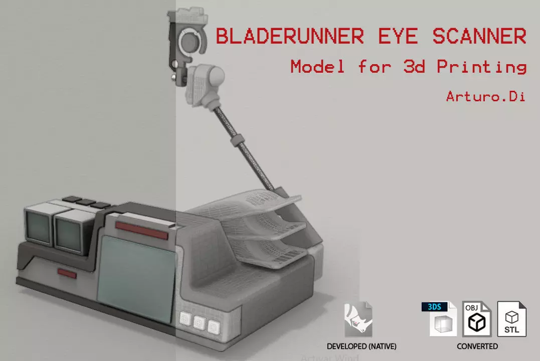 The iconic scanner to identify Replicants from the original movie.Model parts in one single file in 4 different formats.Size of the finished model: L: 240mm x W: 174mm x H: 265mAll pieces all ready are finished parts with width and assembly joints (Thicker width on the body (5mm) than the other parts (2-1.5mm)You can change the 3d printed parts (simulating tubes) for 1/4" metalic bar/tube (6.35mm diameter)
