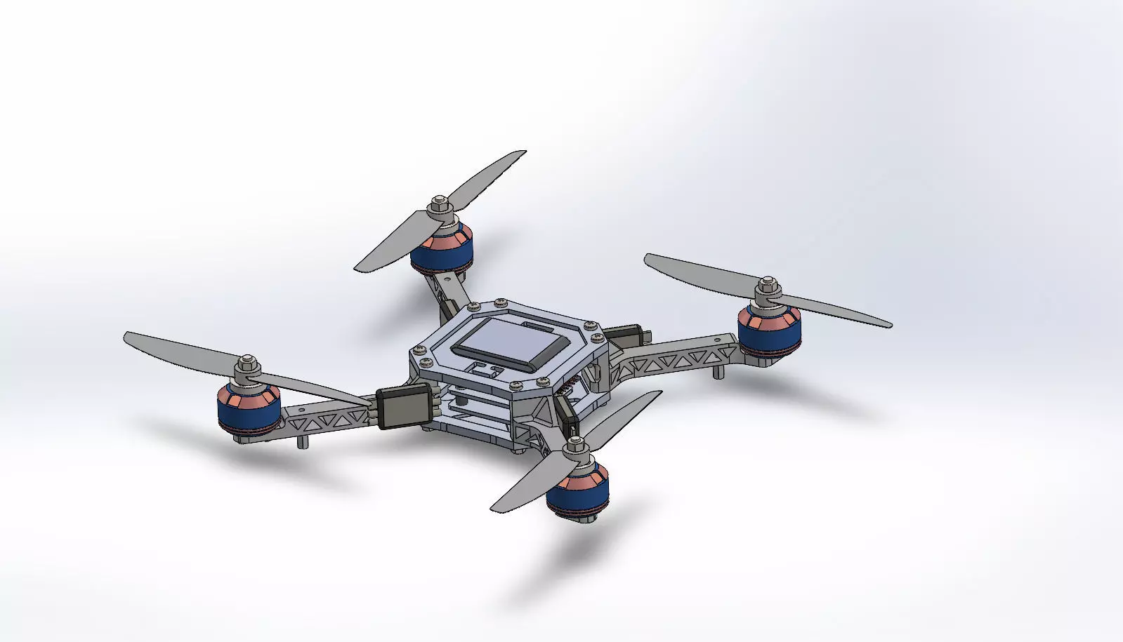 This is a detailed modular quadcopter drone 3D model designed in SolidWorks. The design includes: