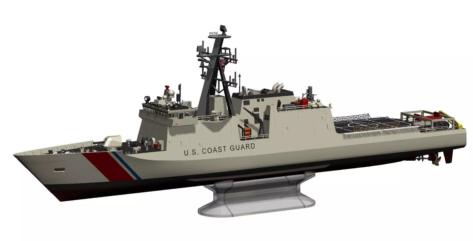 3D model descriptionThe Legend Class National Security Cutter is the backbone of the United States Coast Guard's deepwater fleet — a powerful, oceangoing vessel designed for the most demanding maritime law enforcement, search and rescue, and national defense missions. Our 1:96 scale model captures her imposing presence at an impressive 1.3 meters in length, meticulously shaped using extensive photographic reference of USCGC Bertholf, combined with available blueprints of similar vessel types to ensure accurate proportions and authentic detail throughout. The package includes over 220 STL files covering the full hull and a wealth of accessories, including operational sliding rear ramp doors, four hangar door variants to display her as you choose, and a fully detailed 1:96 scale Phalanx CIWS that matches the ship perfectly — yet holds enough geometric precision to be scaled up to an impressive 40 cm standalone display model without losing its character. The model is also fully RC-ready, with articulated control surfaces and motor mounts built in from the ground up.