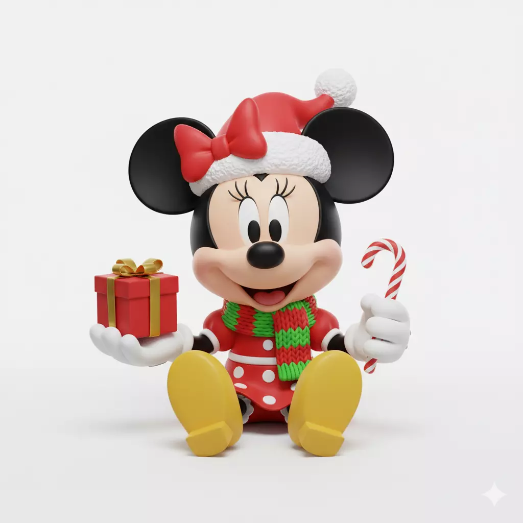 A cheerful, stylized 3D model of Disney's iconic Minnie Mouse, seated and dressed in a festive Christmas theme. She wears her classic black ears, a large red bow, a red Santa hat, and a red dress with white polka dots and fuzzy trim. She also has a cozy red and green striped scarf. Minnie is posed sitting, holding a small, wrapped red gift box with a gold bow in one hand and a striped candy cane in the other. The model features a smooth, high-quality, collectible figure aesthetic.