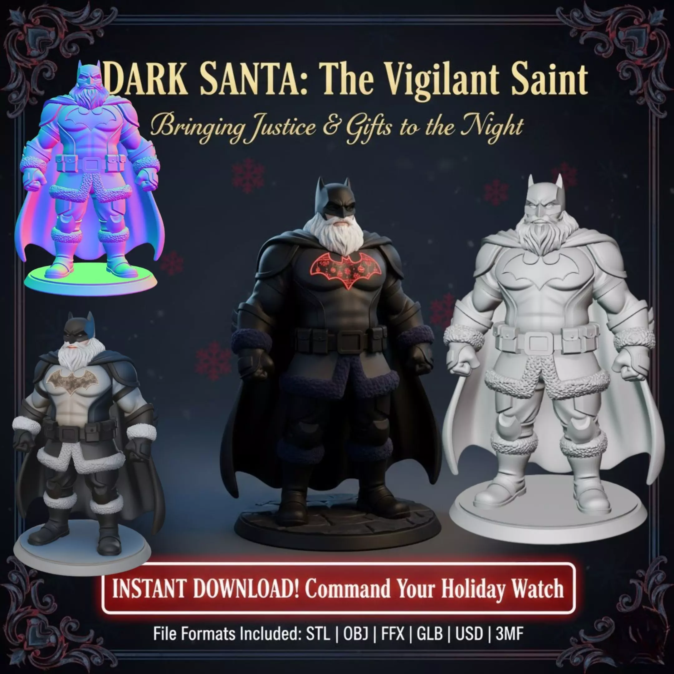 Contact me for custom models and projects.This original design blends the iconic Dark Knight aesthetic with a winter holiday theme, creating a powerful and imposing collectible figure. Heavy tactical armor, rough fur trims, muscular proportions, and a grim atmosphere make it a perfect fit for Batman fans, dark-themed collectors, and those seeking unique holiday décor. The snowflake-patterned chest emblem, sharp armor panels, and strong stance give the model a striking presence for shelves, showcases, and display collections. High-resolution surface textures and a print-friendly structure ensure excellent results for both hobbyists and professionals.