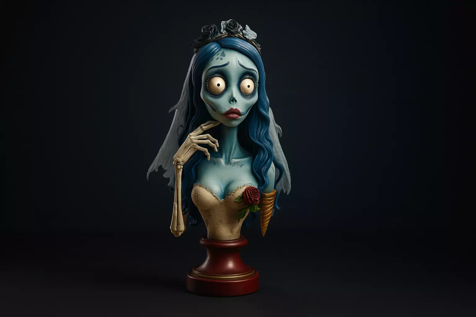 Bring a touch of gothic charm to your collection with this beautifully crafted 3D-printed bust inspired by Emily from Corpse Bride. Designed with meticulous attention to detail, this sculpture captures the ethereal elegance, haunting beauty, and whimsical melancholy of the beloved blue-haired bride. From the expressive wide eyes to the delicately sculpted skeletal arm and flowing hair, every element enhances the emotional depth and fantasy aesthetic that fans adore.Perfect as a display piece for collectors, Halloween decor enthusiasts, stop-motion film fans, or anyone who appreciates finely detailed artistic prints. The figure is produced using high-quality materials that allow for crisp detail and durability. Whether placed on a shelf, desk, or featured in a themed display, this piece brings a magical, eerie, and enchanting presence to any space.Each bust is printed with care and attention, making it an exceptional gift for fans of gothic animation, dark fantasy, or romantic macabre art. Add this unique character sculpture to your collection and celebrate the timeless charm of beautifully spooky storytelling.