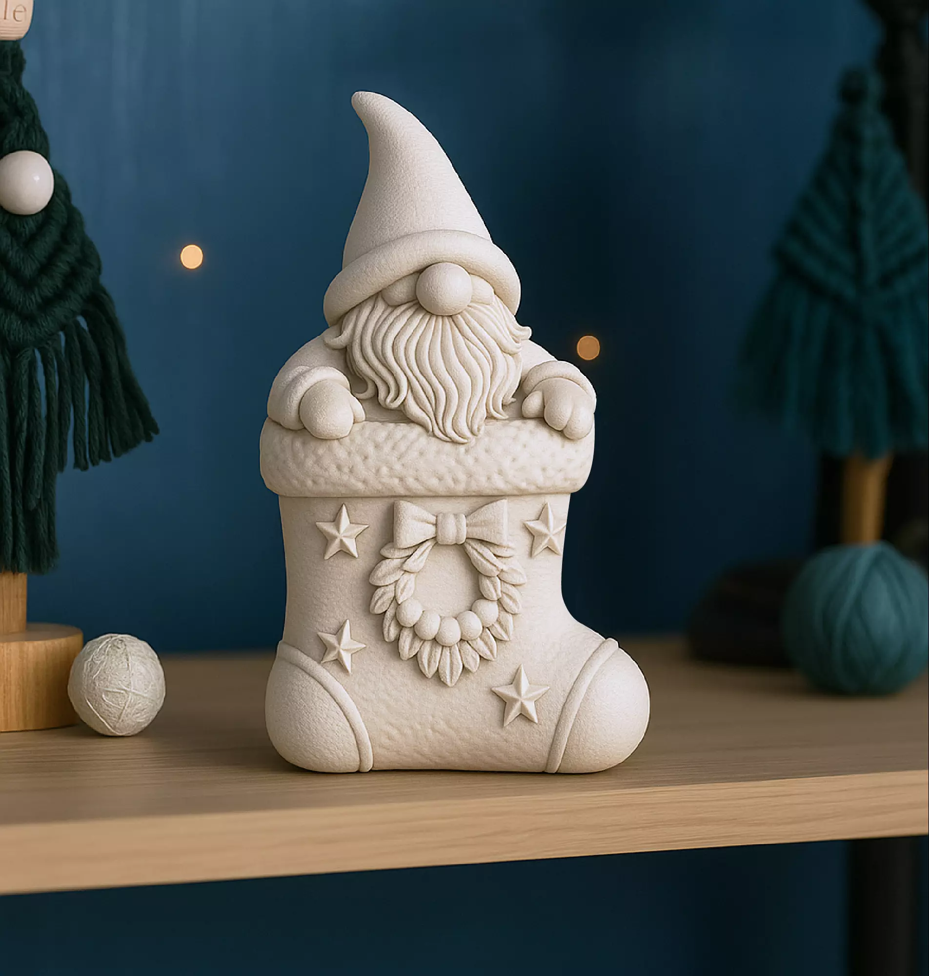 This digital STL file features a sweet gnome peeking out of a plush Christmas stocking adorned with stars, a bow, and a detailed wreath. Its soft, rounded shapes and storybook-style design make it the perfect tabletop decoration, tree side accent, or handmade gift for anyone who loves whimsical holiday decor. Whether printed in classic red-and-white, warm neutrals, or playful pastel colors, this delightful figure adds instant warmth to mantels, shelves, and Christmas village displays. Easy to print and full of personality, it brings a joyful handmade touch to your seasonal setup.