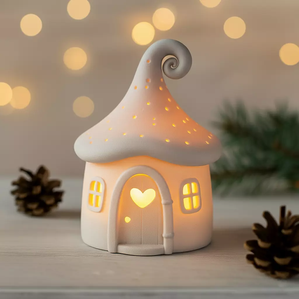 This digital STL file features a whimsical mushroom style house with a gently curved roof, heart-shaped door, and window cutouts that let soft light shine through. Perfect for LED tealights, it transforms any space into a peaceful woodland corner filled with festive glow. Ideal as Christmas decor, a fairy home accent, or a unique handmade gift, this design brings together the charm of fantasy and the comfort of home. Whether printed in snowy white, rustic tones, or pastel colors, this candle holder becomes an eye-catching piece that spreads warmth and wonder throughout your space.