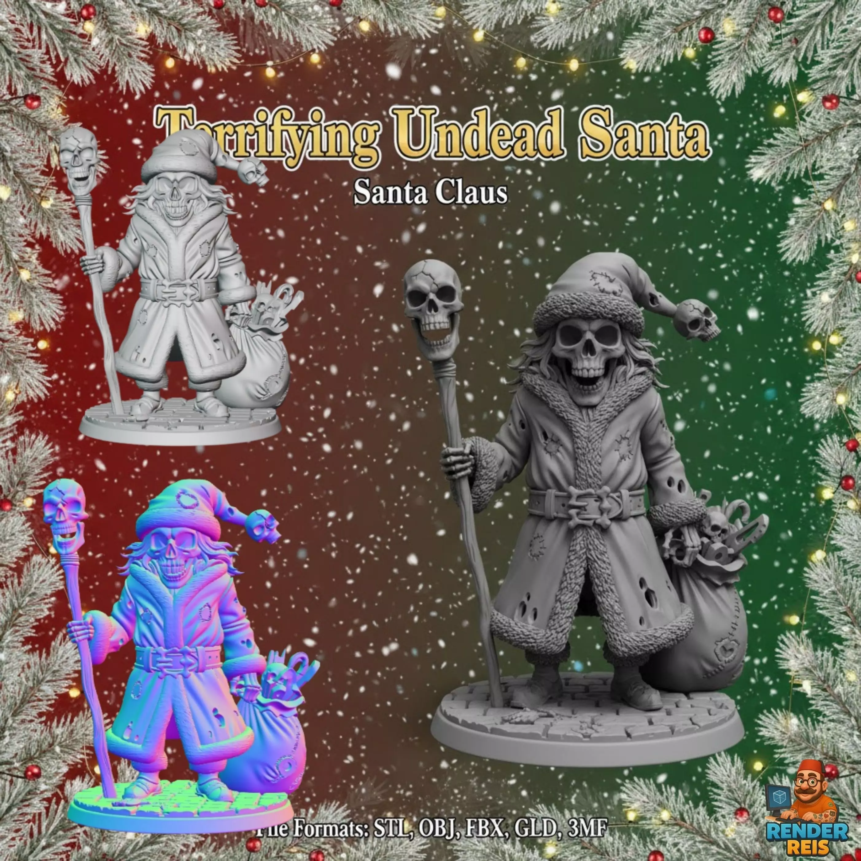 The Terrifying Undead Santa brings a grotesque, dark twist to the classic holiday icon. With a skeletal face, cursed gift sack, and skull-topped staff, this figure blends Dark Fantasy, Gothic Cartoon stylization, and X-mas Horror aesthetics into a striking miniature.