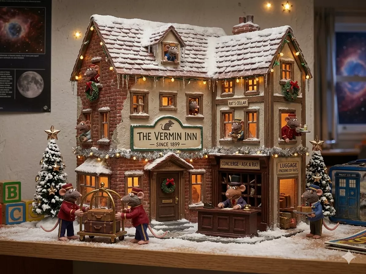 The Vermin Inn: Where Every Crumb is a Feast!Looking for a place to stay that’s a bit... squeaky? Welcome to the Vermin Inn, the premier destination for the discerning field mouse on holiday. Situated conveniently behind the pantry and slightly to the left of the radiator, this festive boutique hotel offers a rustic, chewed-from-scratch aesthetic that you won't find anywhere else.