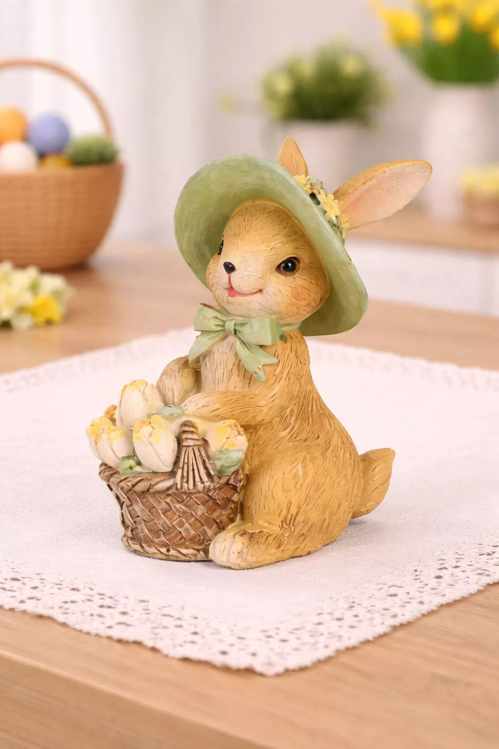 A standout feature of this model is the decorative pastel hat, adorned with small floral details and paired with a soft ribbon bow around the neck. These elements enhance the spring theme while adding visual contrast and storytelling depth. The basket is intricately designed with a woven pattern, and the included flowers provide additional color variation and organic detail, enriching the overall composition.