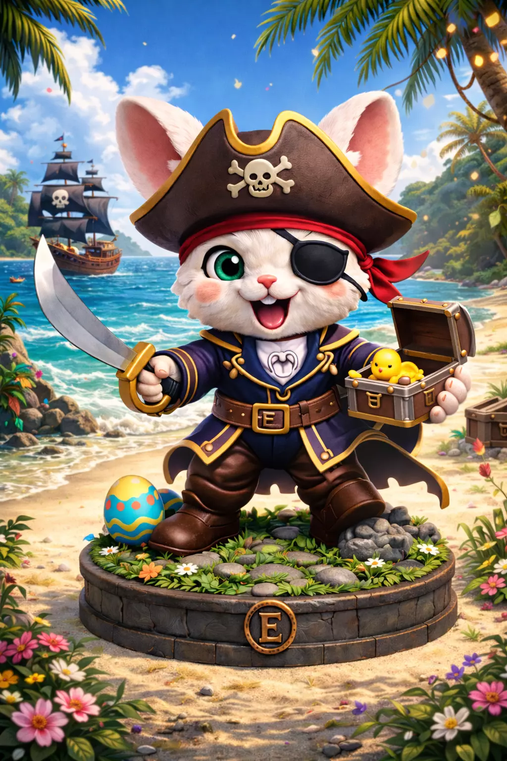 The bunny is dressed in a detailed pirate outfit, including a classic coat with gold trims, belt, and accessories that give it an adventurous, treasure-hunting look. The character holds a curved pirate sword, reinforcing its bold and confident stance.