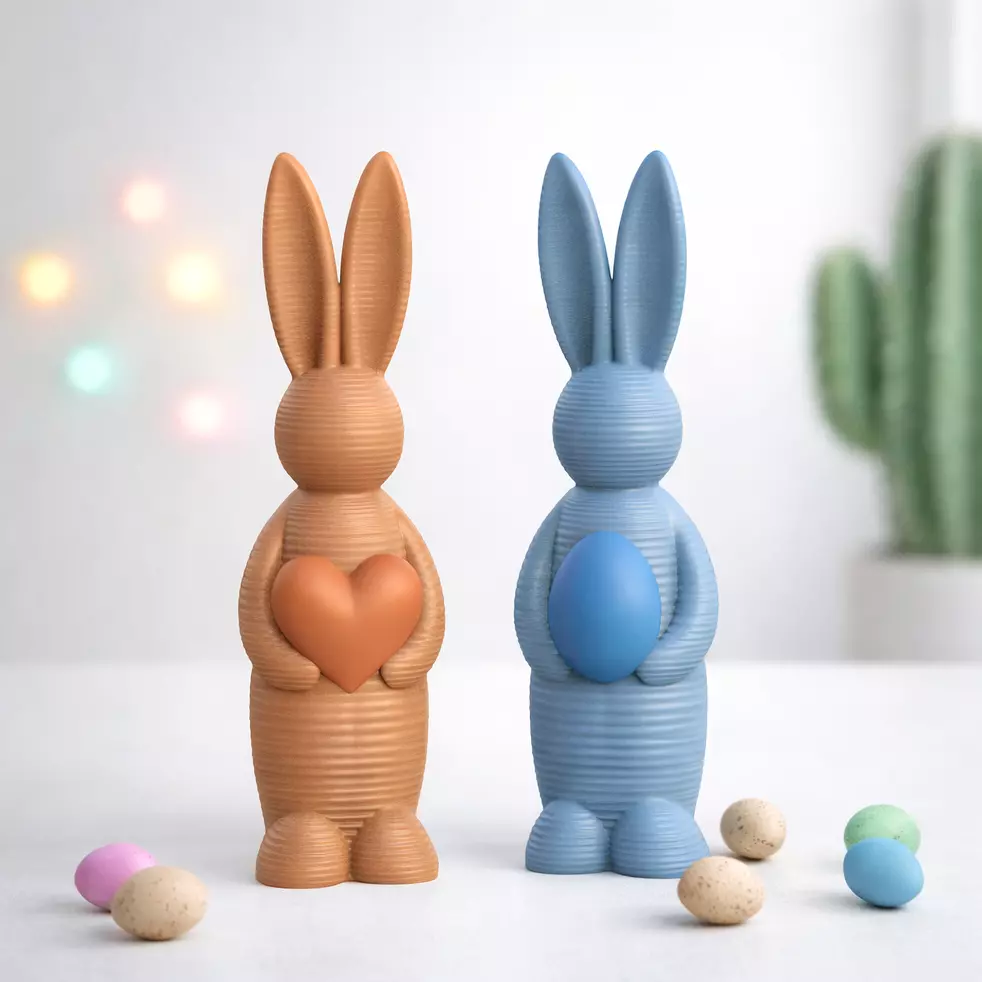 Each bunny features a beautifully layered, ribbed design that gives the figures a soft, handcrafted look. One holds a classic Easter egg, while the other carries a heart, symbolizing joy and affection. These complementary poses make them ideal for shelf displays, table arrangements, or gift sets. Their modern striped surface adds depth and visual interest, turning a simple decoration into an elegant seasonal accent. Whether printed in pastels or bold spring colors, they bring a cozy and joyful vibe to any setting.