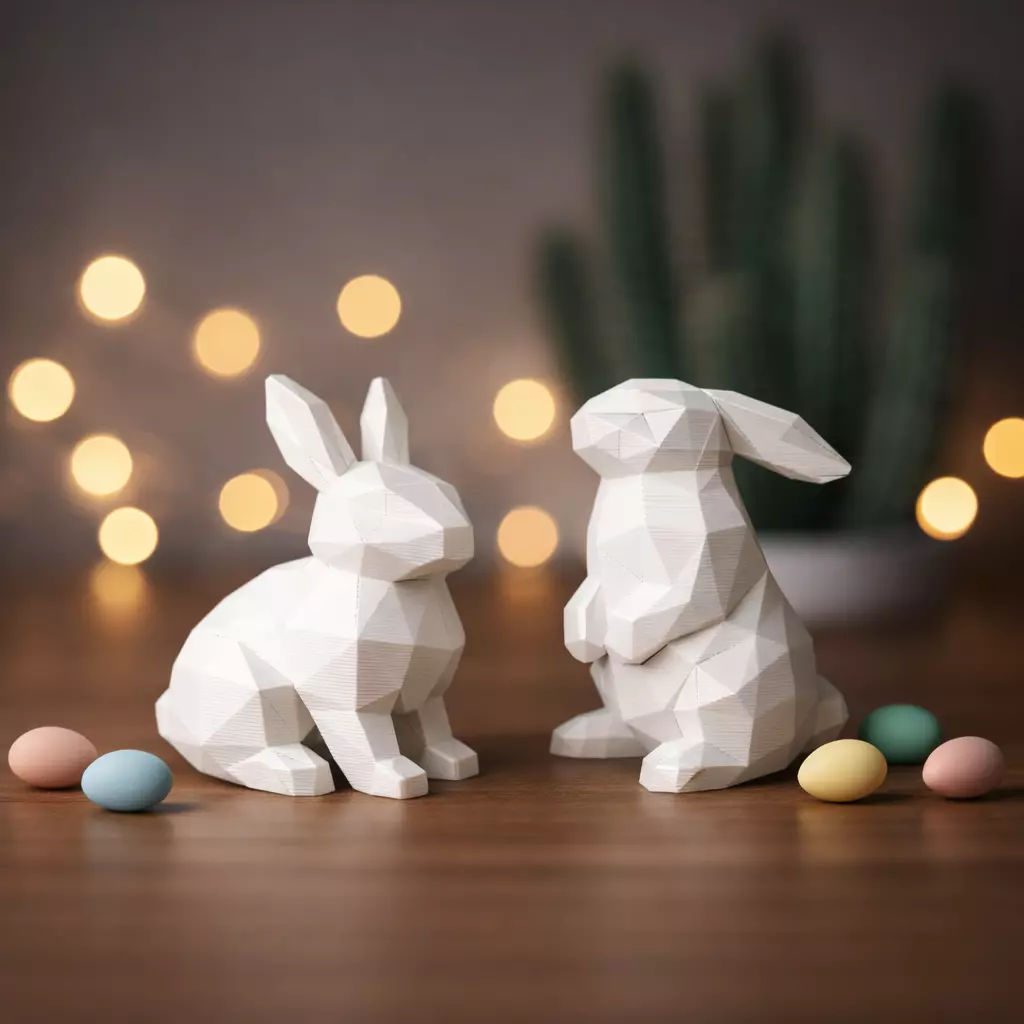 This minimalist pair features clean polygonal surfaces and elegant symmetry, creating a striking balance between art and design. The set includes two distinct rabbit poses, one sitting calmly, the other standing alert, perfect for displaying together as a stylish spring centerpiece or separately around your home. Ideal for modern interiors, Easter table decor, or gift ideas for design lovers, these bunnies bring a refined touch of artistry to your 3D prints. Whether printed in matte white, pastel tones, or metallic finishes, they instantly elevate any space with modern simplicity.