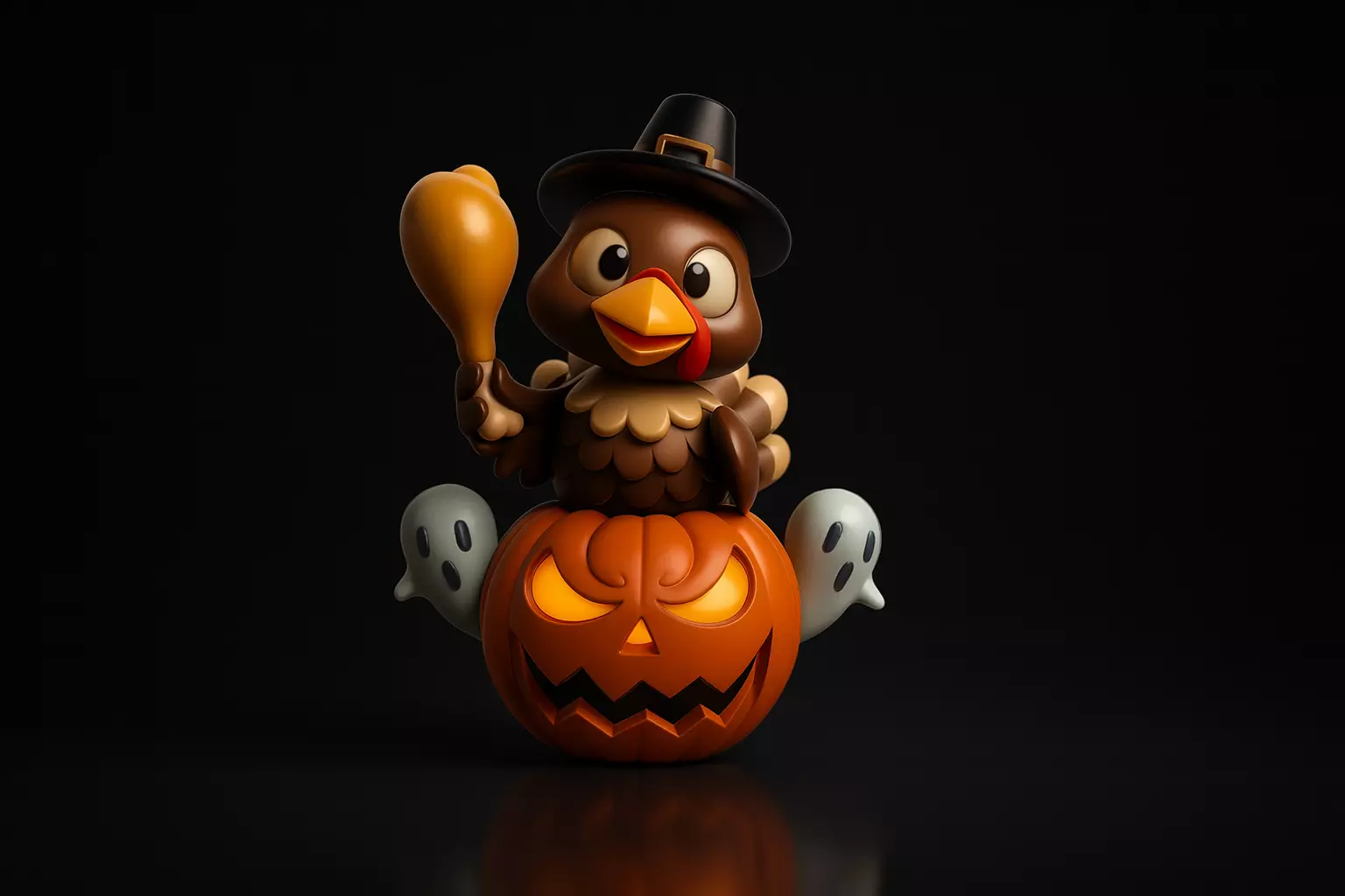 Celebrate both Halloween and Thanksgiving with this fun 3D printed turkey-on-pumpkin figurine! This unique design features a cheerful turkey wearing a pilgrim hat, holding a drumstick, and riding atop a spooky carved pumpkin with two friendly ghosts floating beside it. A perfect crossover between Halloween spookiness and Thanksgiving charm, this decoration adds humor and warmth to your seasonal setup. Ideal for display on your mantel, desk, or as a centerpiece for your autumn festivities. Crafted with attention to detail, this model makes a delightful gift for holiday lovers, collectors, and 3D print enthusiasts alike.