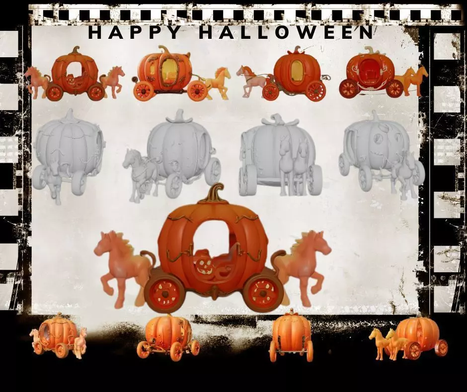 A highly detailed 3D printable Halloween pumpkin-themed magical carriage, perfect for FDM or resin printers. The carriage is designed to look like a whimsical fairytale vehicle, with the main structure shaped like a large glowing pumpkin. The pumpkin has a smooth, shiny surface with subtle glowing lines running across it, resembling the intricate patterns of vines and leaves. The pumpkin is split in half, creating a carriage body, with golden ornate door handles and decorative hinges. The wheels are large, round pumpkins with carved faces on them, giving them a playful, spooky look. The pumpkin carriage is pulled by four magical ghostly horses, whose bodies are ethereal and semi-transparent, with wisps of smoke trailing behind them. The carriage has intricate details like golden filigree, swirling patterns, and glowing jack-o’-lanterns on the front and sides. The interior is plush, with tiny cushions and a soft glowing light coming from within. Designed with a combination of Tim Burton's gothic charm, Disney fairytale aesthetics, and Funko Pop's whimsical style. Optimized for support-free 3D printing, with smooth transitions, solid proportions, and clean contours.