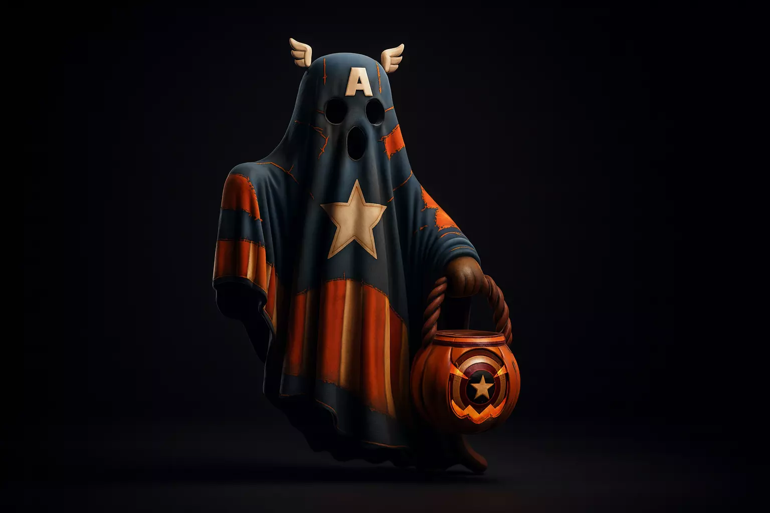 Bring a unique twist to Halloween with this 3D printed Captain America ghost decoration! Designed with a fun mix of spooky and superhero style, this figure features a ghostly sheet patterned in Captain America’s iconic colors, complete with star emblem and “A” detail on the head. It also holds a pumpkin bucket with matching superhero shield accents, making it a perfect collectible for fans of Marvel and Halloween alike.