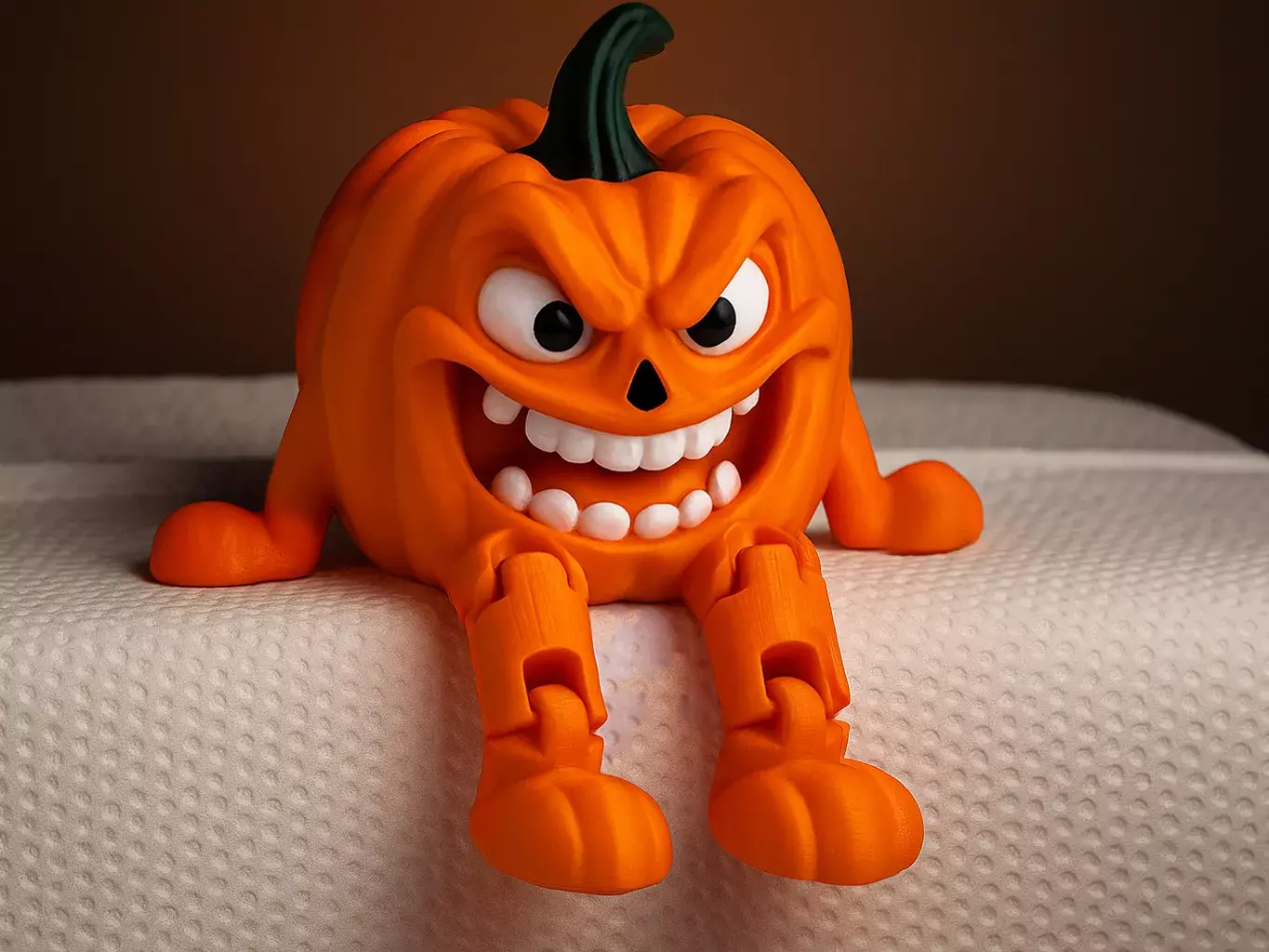 A stylized crawling pumpkin monster with expressive eyes, a wide toothy grin, and articulated forelegs designed to clip together post‑print for dynamic shelf poses on edges, desks, or mantels. The model is separated into body, left/right arm segments, eyeballs, and stem for easy multicolor printing and quick assembly without screws.