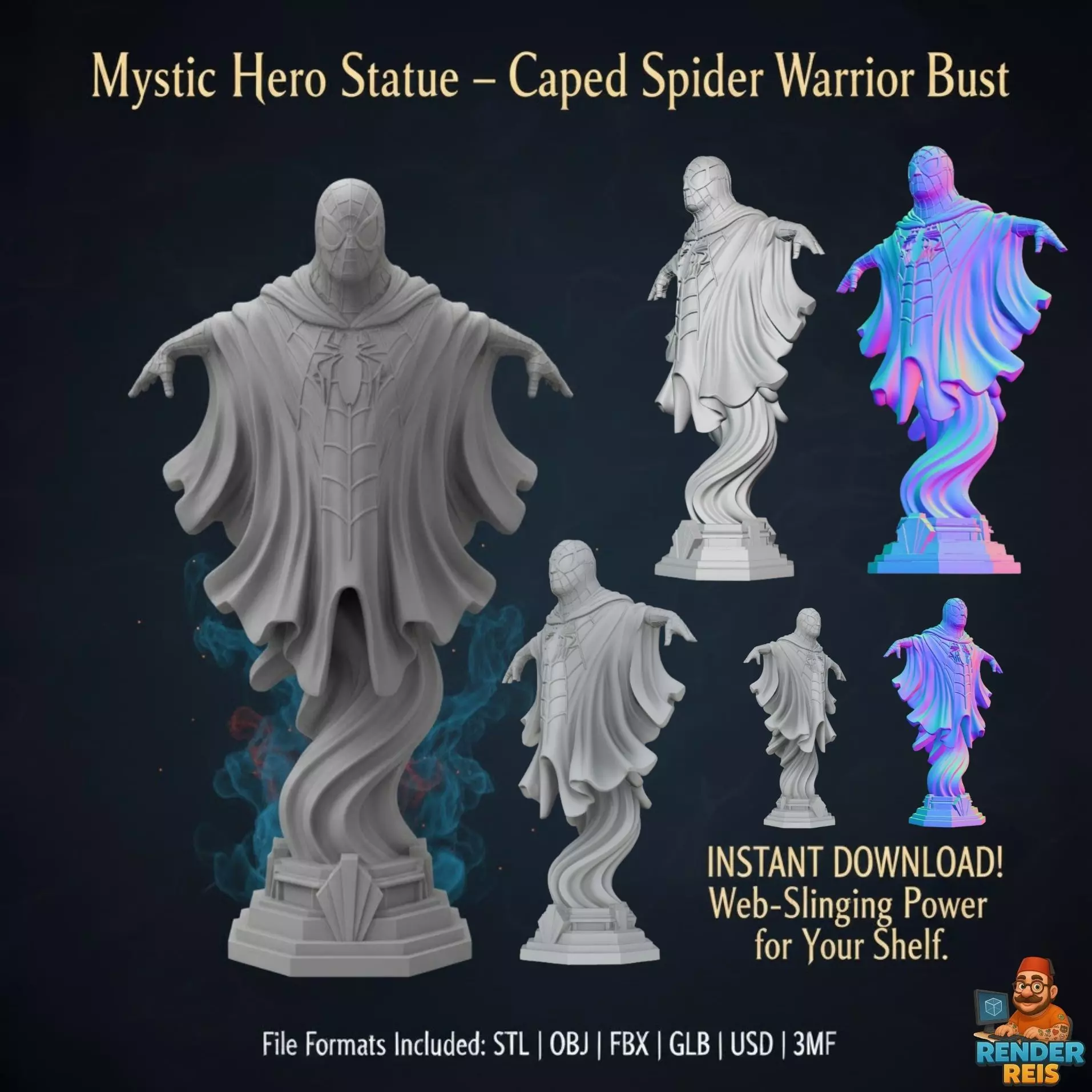 Contact me for custom models and projects.The Mystic Hero Statue reimagines a spider-inspired superhero with a dark and spiritual aesthetic. Flowing cape dynamics and wind-swept motion effects bring the statue to life, while the detailed web pattern across the mask preserves the iconic essence of the character.