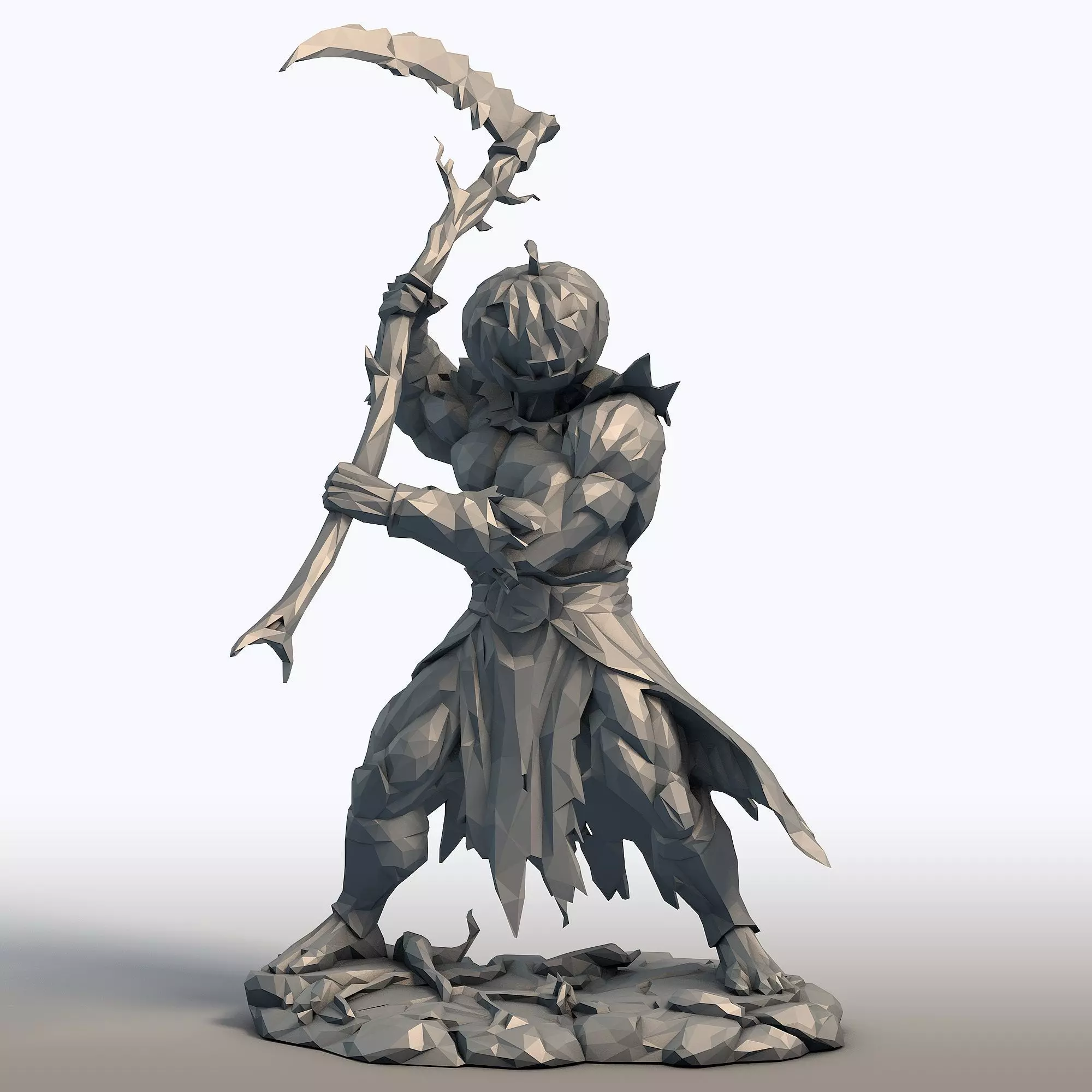 Low poly muscular warrior figurine featuring a jack-o-lantern pumpkin head wielding a detailed scythe. This formidable sculpture combines a powerfully defined athletic physique with spooky seasonal aesthetics, showcasing detailed musculature, dynamic posing, and a menacing scythe weapon. The pumpkin head features carved facial details that enhance its eerie character. Perfect for Halloween displays, tabletop gaming, fantasy collections, or unique decorative pieces. Optimized for easy 3D printing with support-free design and stable base.