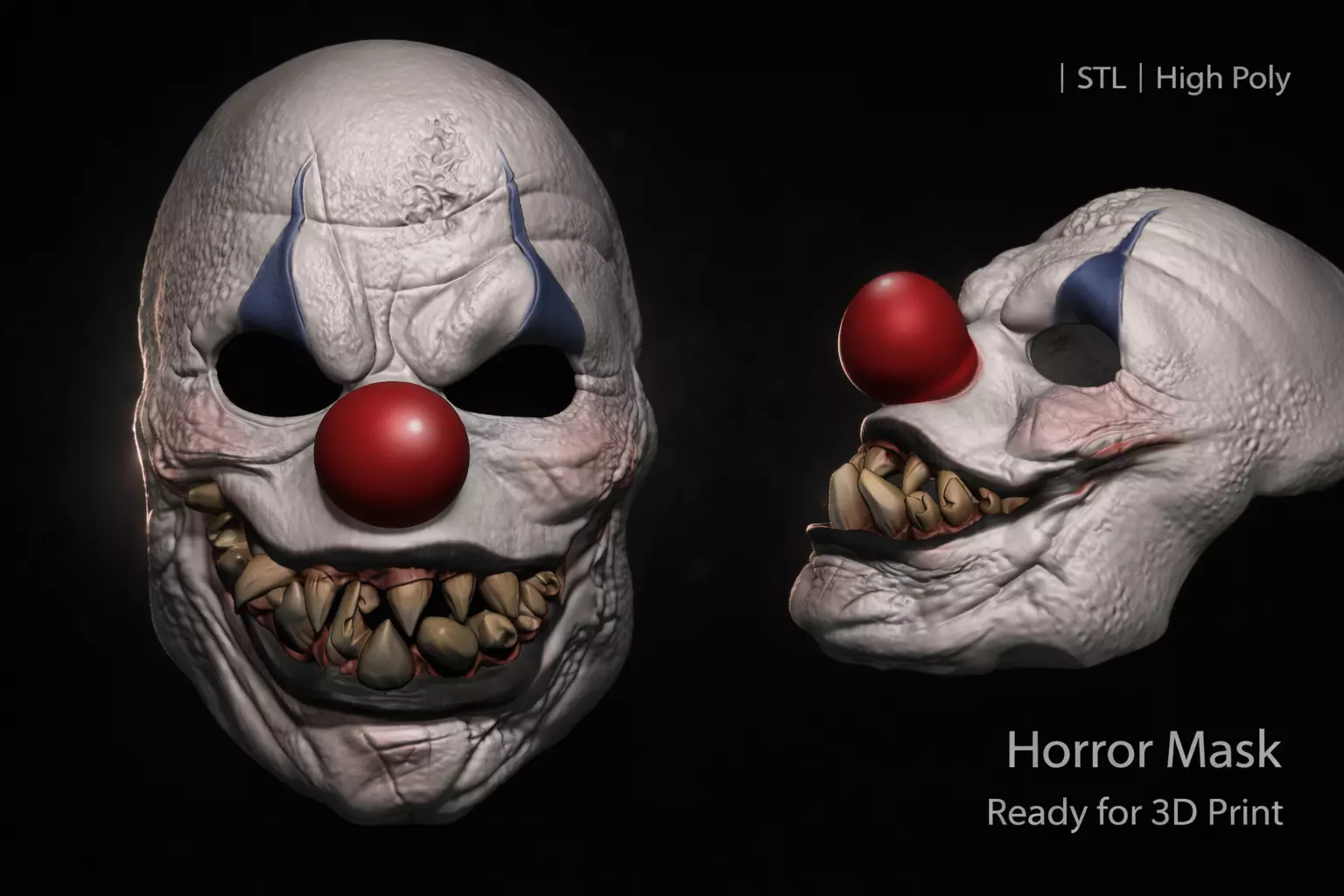highly detailed horror clown mask, designed for 3D printing, cosplay, Halloween, and collectible display.