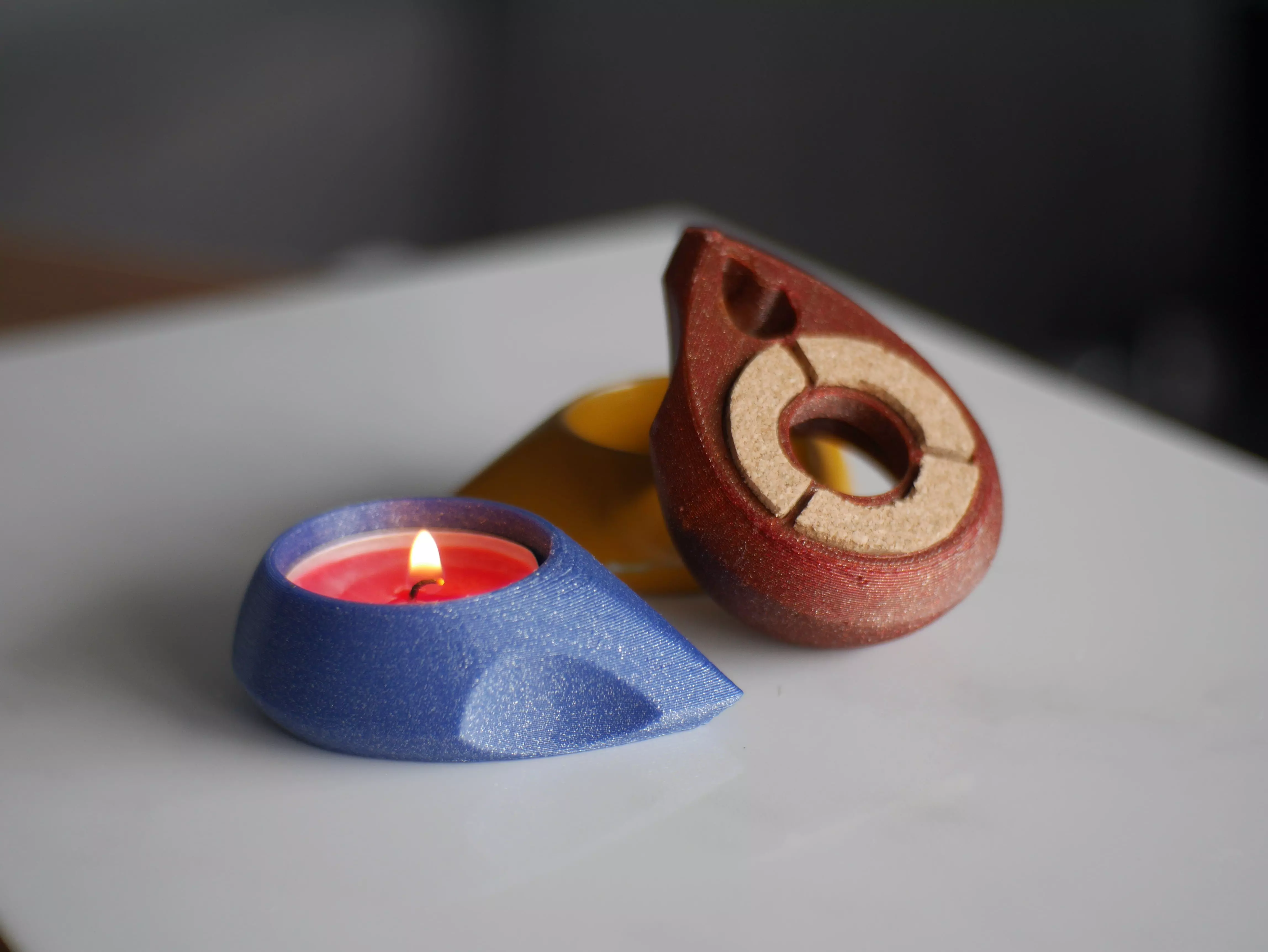 Probably my favourite tealight. Designed to look like a flame and when you look at it from the bottom you can even see tealight in there. I probably made like 50 iterations of this one from card ones over blue foam model to resin and plaster casts. The one you see here is a 3D model of what is likely the final version of this one and if you want to see the whole process of it being designer keep an eye on mu Behance page where I'm planning to show it at some point.As always I tried to keep it minimalist but practical so it fits in pretty much any modern environment while being practical having grooves for wax overspill if made from suitable material and with a hole on the bottom for easy extraction of tealights themselves.They can be used without base pads but it depends on where you want to put them and what will you print it in. In general, I use them without it and only make pads from if I'm giving them to someone either laser cut them or cut them with a scalpel from cork or print them from TPU. Also and I always to forget to mention this if you do use base pads it will make tealights stackable.