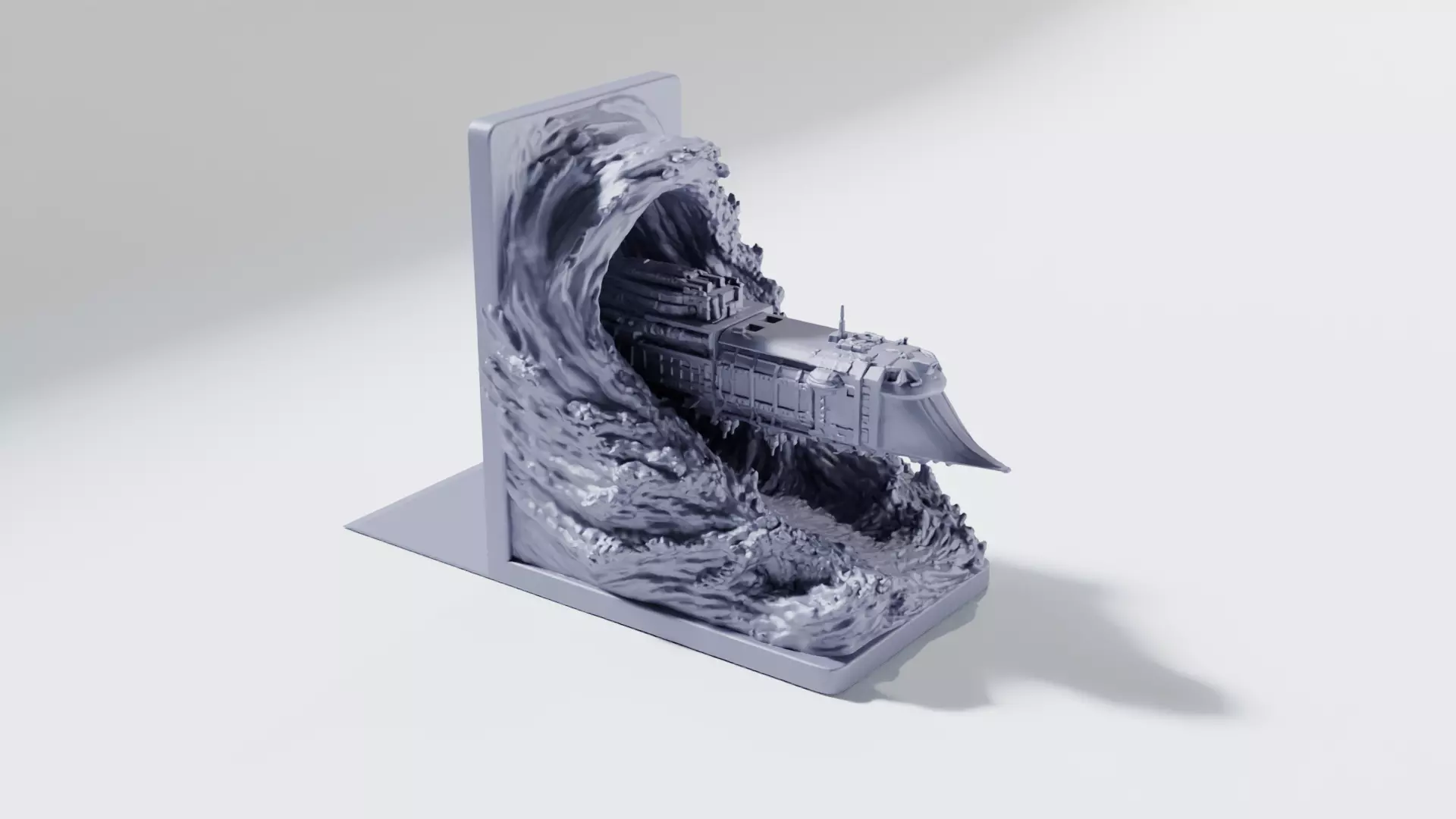 The scene reads instantly: a blocky, heavily armored prow, layered superstructure, and militaristic detailing bursting through a curling “warp” wave like the universe itself is trying to swallow the ship back down. It’s made to look insane on a shelf, especially with dry-brushing and a little edge highlight.