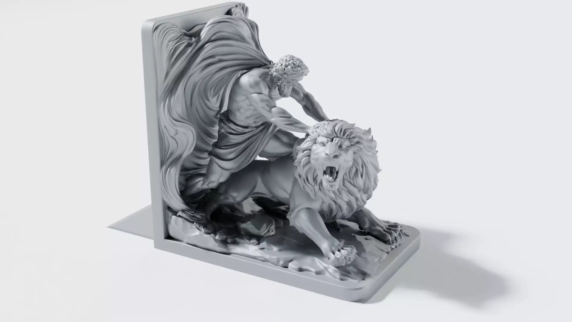 This is a digital 3D model (OBJ format) designed for 3D printing: a dramatic bookend depicting Heracles wrestling the Nemean Lion—a legendary moment from Greek myth captured as a high-detail sculptural scene. The figure, lion, and flowing backdrop are integrated into a sturdy bookend “L” form with a clean rear plate and a solid base, making it both functional on a shelf and display-worthy as a miniature statue.