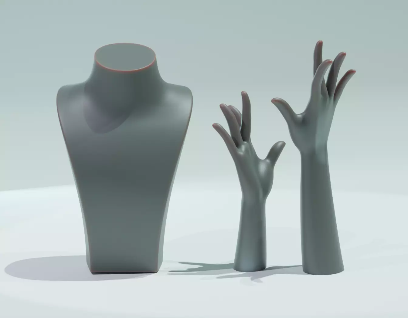 A long hand standing tall to show off elegantly your rings and bracelets. Included is a slightly shorter hand with the shorted forearm portion. The tall one is 8 inches high the shorter hand holder is 6 inches.