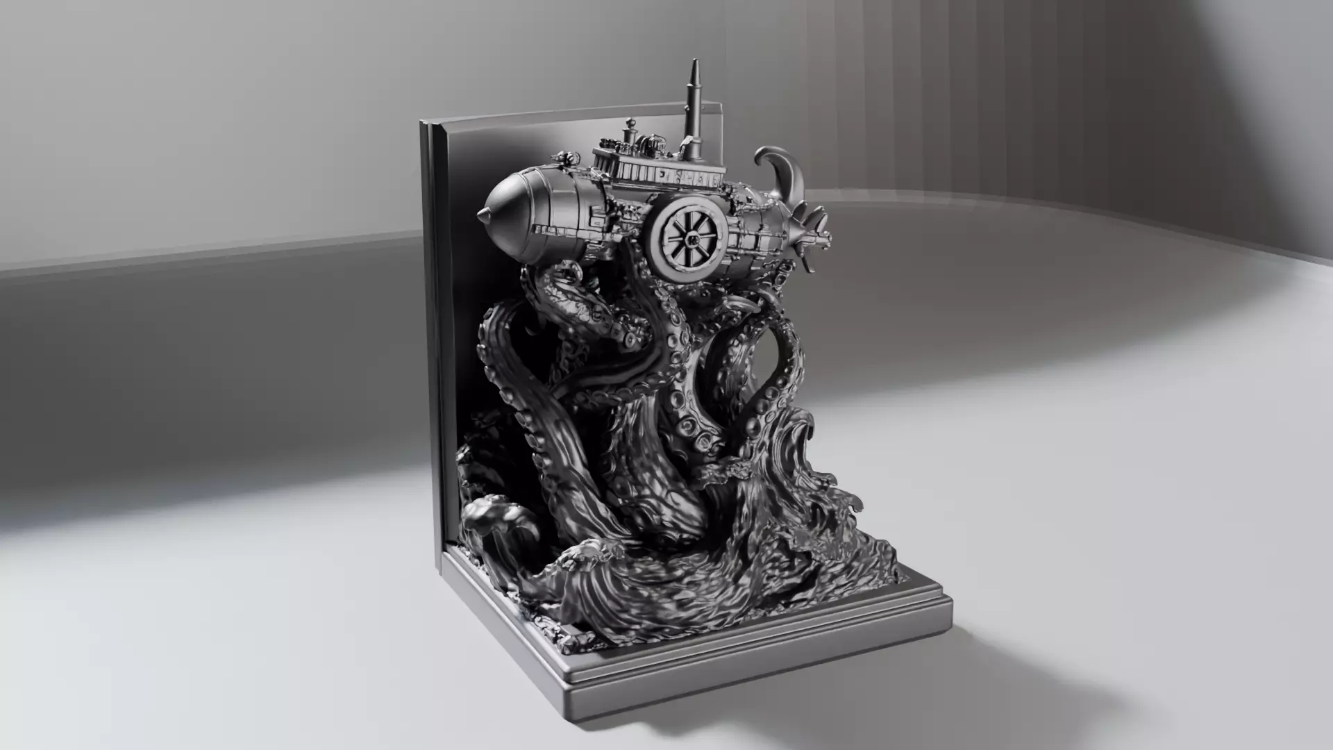Designed with both aesthetics and functionality in mind, the bases are weighted for stability, ensuring even your heaviest hardcovers stay upright. The model features intricate rivet detailing on the hull, realistic suction cups on the tentacles, and dynamic water displacement effects at the base.
