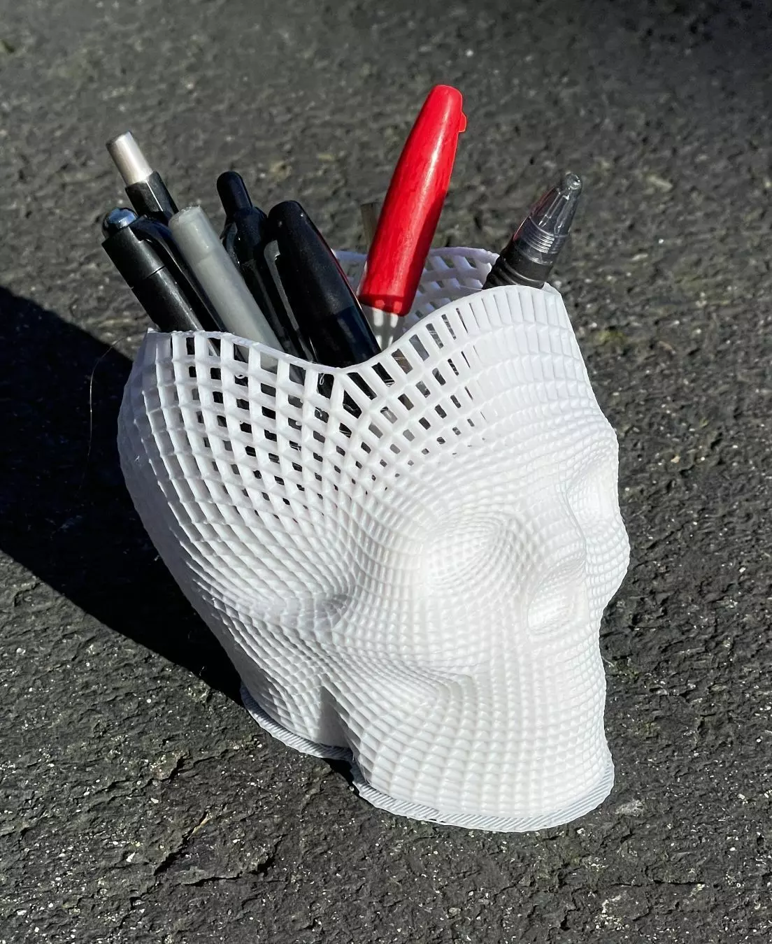 Introducing the Wireframe Skull Pencil Holder, a striking and functional piece that seamlessly blends artistry with utility. This 3D-printed pencil holder features an intricate wireframe design of a skull, adding a touch of edgy sophistication to any desk or workspace.