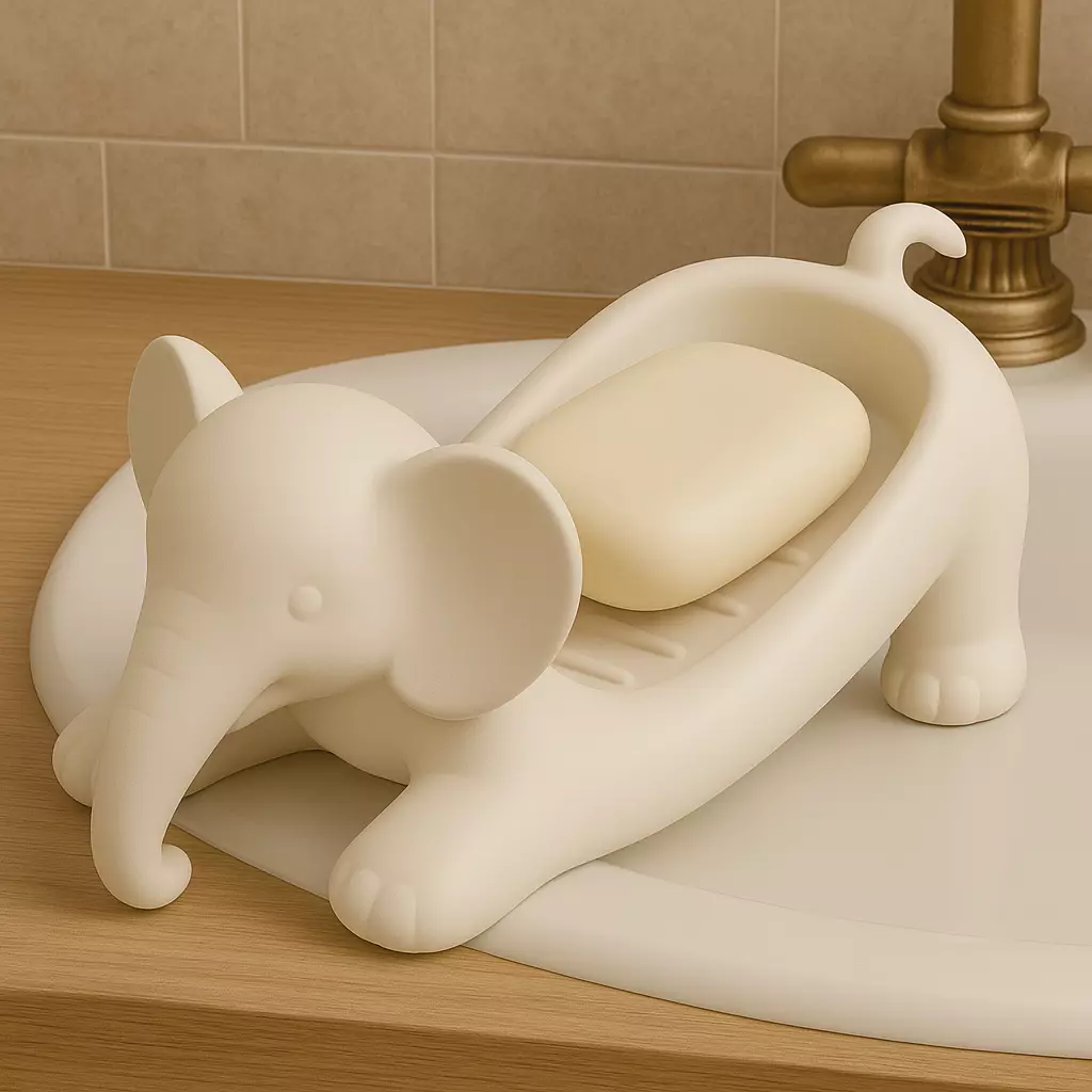 This 3D model features a cute and functional elephant-shaped soap holder designed for bathroom or kitchen use. The sculpt includes a smooth, rounded elephant body with a built-in tray cavity sized to hold standard soap bars. The integrated drainage grooves help keep the soap dry, while the four-leg base ensures stability on counters and sinks.