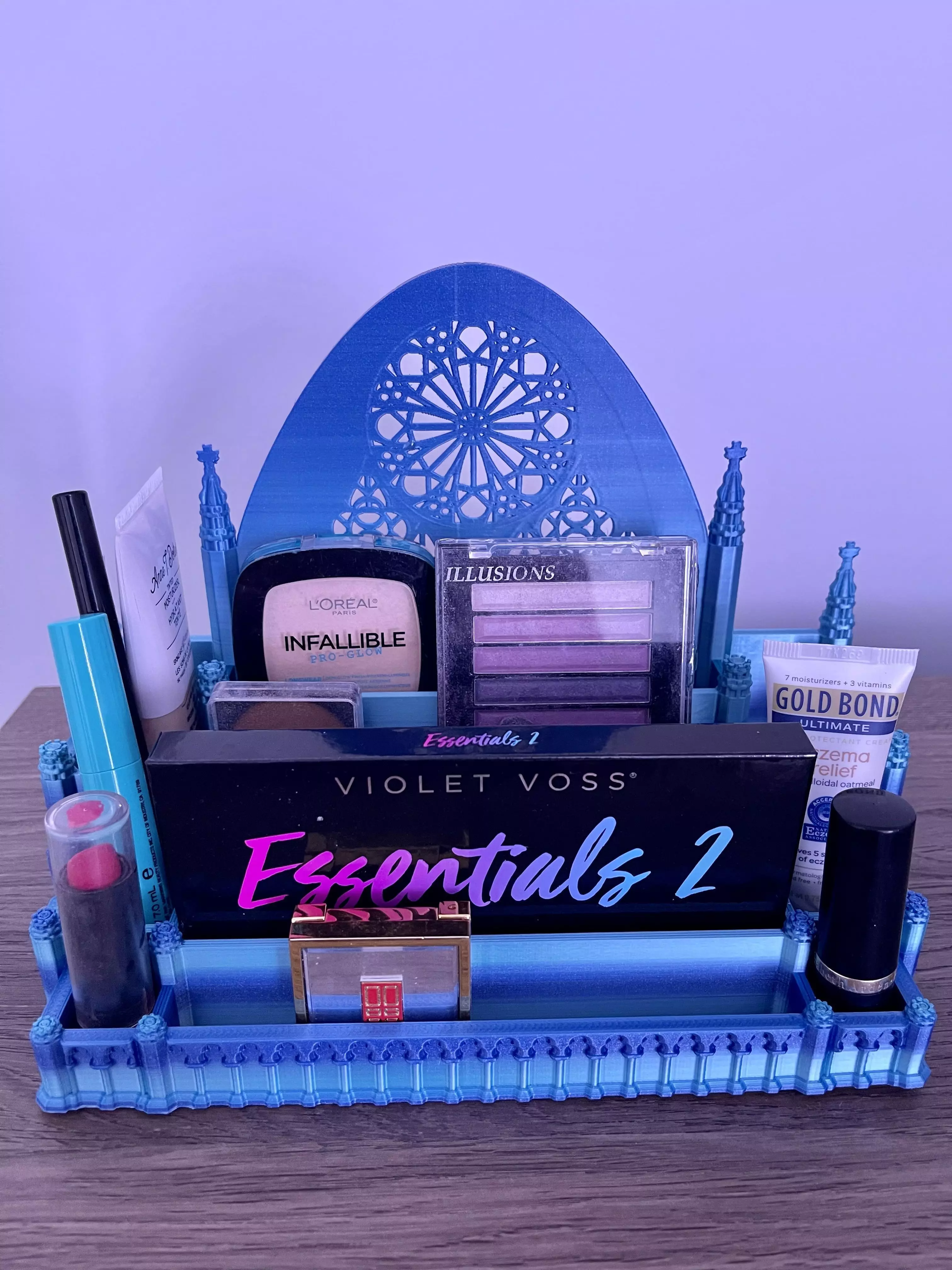 This is a makeup holder that will fit palettes, brushes, lipsticks, mascara, just about anything you can throw at it. You can even use it to hold your phone while getting ready! Hang earrings in the lattice on the stained glass windows, hang necklaces over the spires (or download the necklace display in this same style!). Convenient and beautiful.