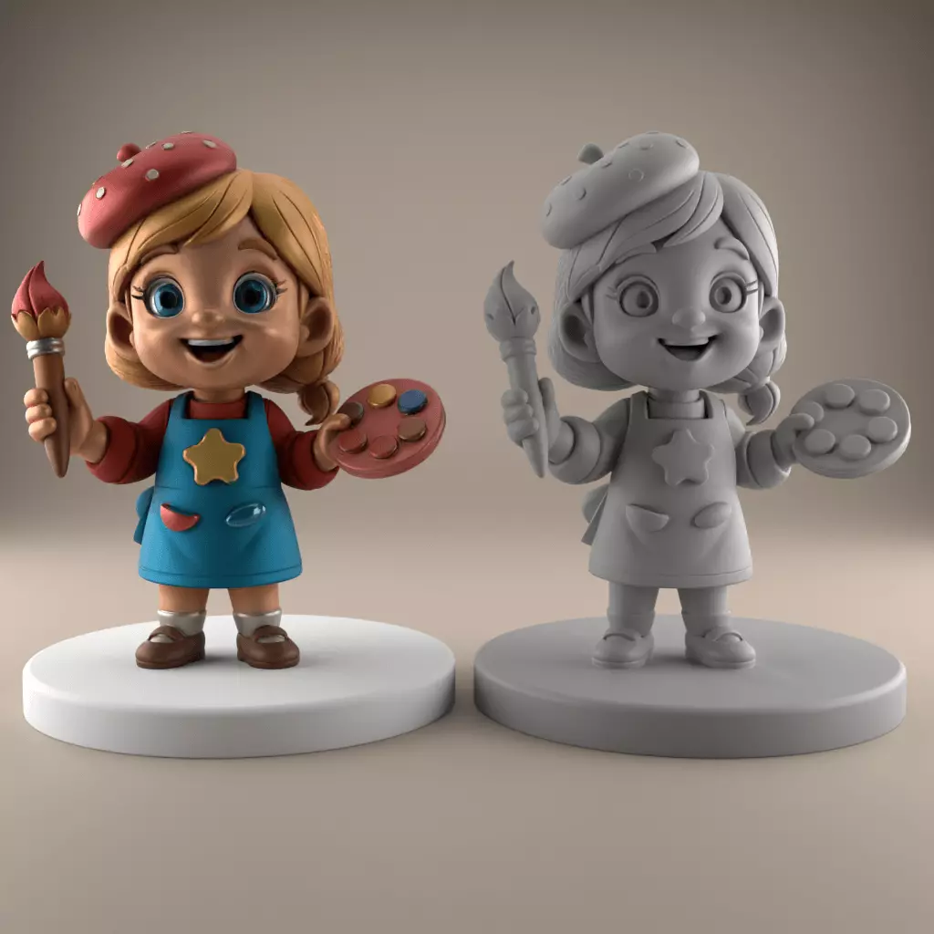 Design ConceptThis 3D artist girl figurine is designed as a playful and colorful desk decoration. Her bright attire and art accessories, like the paintbrush and palette, convey her creative spirit.