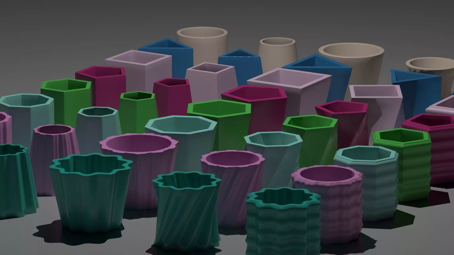 Total of 40 Meshes available for printing. Box,Cylinder,Hexagon,Octagon,Pentagon,Triangle, Ringwave 1 and Ringwave 2 are the types you can print. Each one has 5 different variations: Normal,twisted,Inward scaled,Outward Scaled and Bumpy.