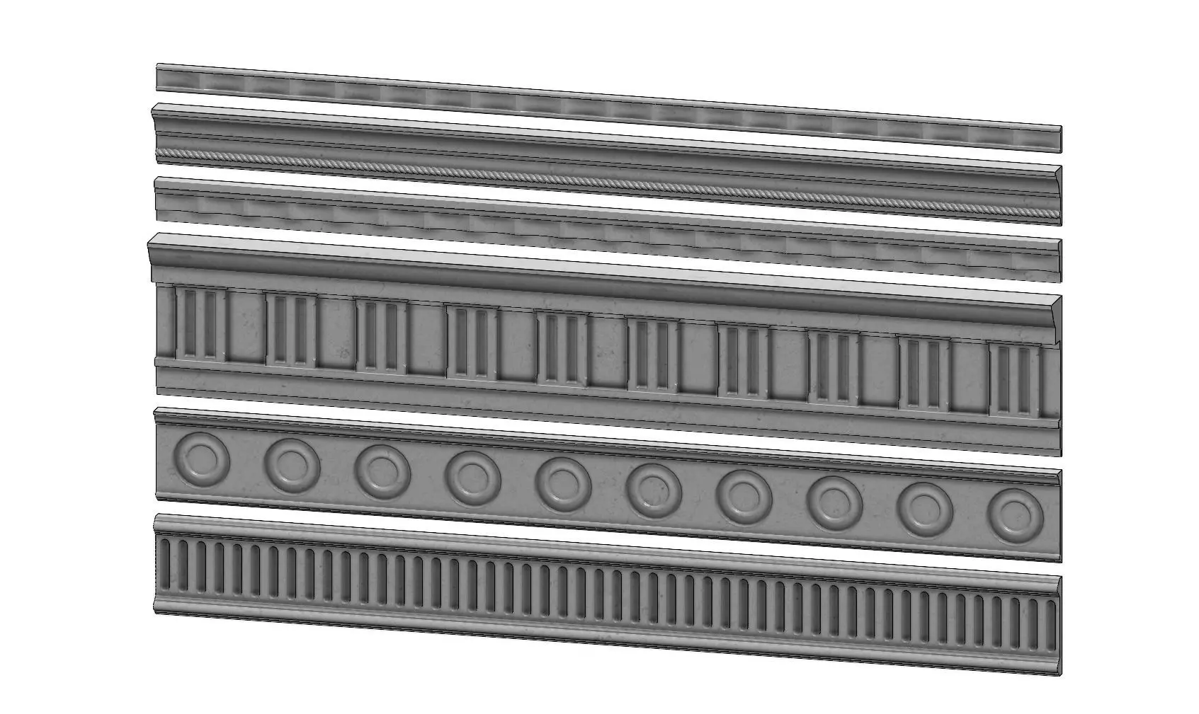 All the models are watertight volumes perfect for 3d printing and cnc machining. All the sharp edges are rounded with a fillet of 1mm All the linear patterns on the cornices are centered on the 2m lenth