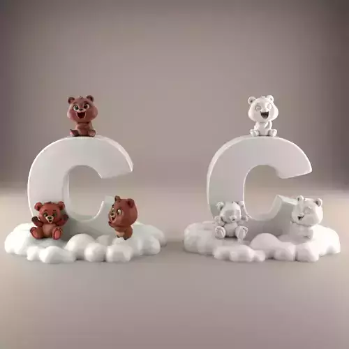 Design ConceptThis model features adorable bear characters interacting around a stylized letter 'C', set on a cloud base to add a whimsical touch.
