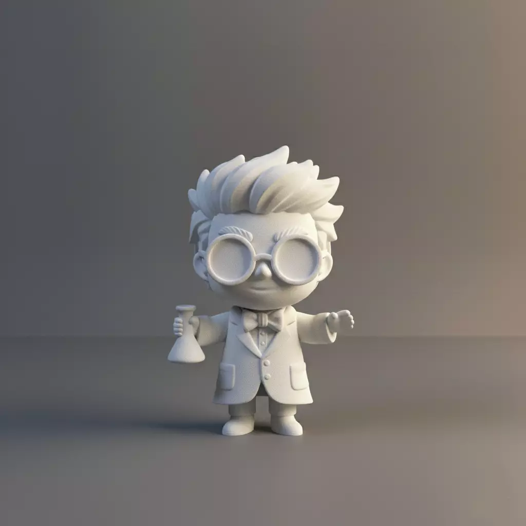 Design ConceptsThis chibi scientist figure combines playful proportions with recognizable elements of a classic scientist, such as glasses, a suit with a bow tie, and a flask. The exaggerated design with large glasses and fluffy hair adds a whimsical touch.