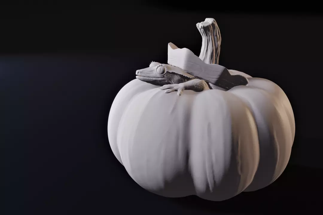 This model comes with two printing options, all which require supports. The pumpkin bottom, top and gecko print separately, with the pumpkin bottom coming whole or split into five pieces for easier printing. Pumpkin is about three inches in diameter, but can be scaled as needed.