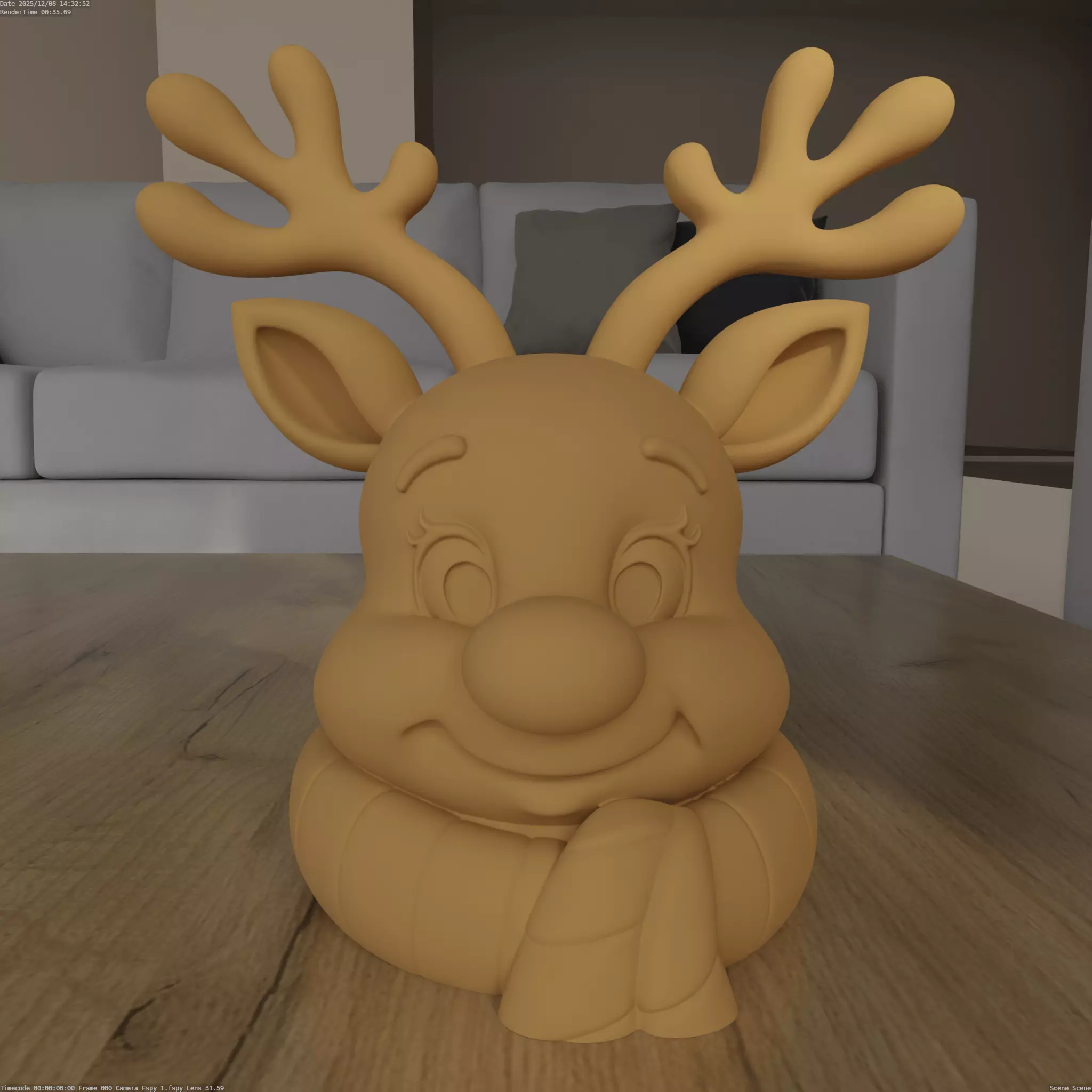 Design ConceptThis 3D model depicts an adorable reindeer with antlers and a friendly smile, complete with a scarf design that gives it a cozy, festive look—ideal for Christmas decor.