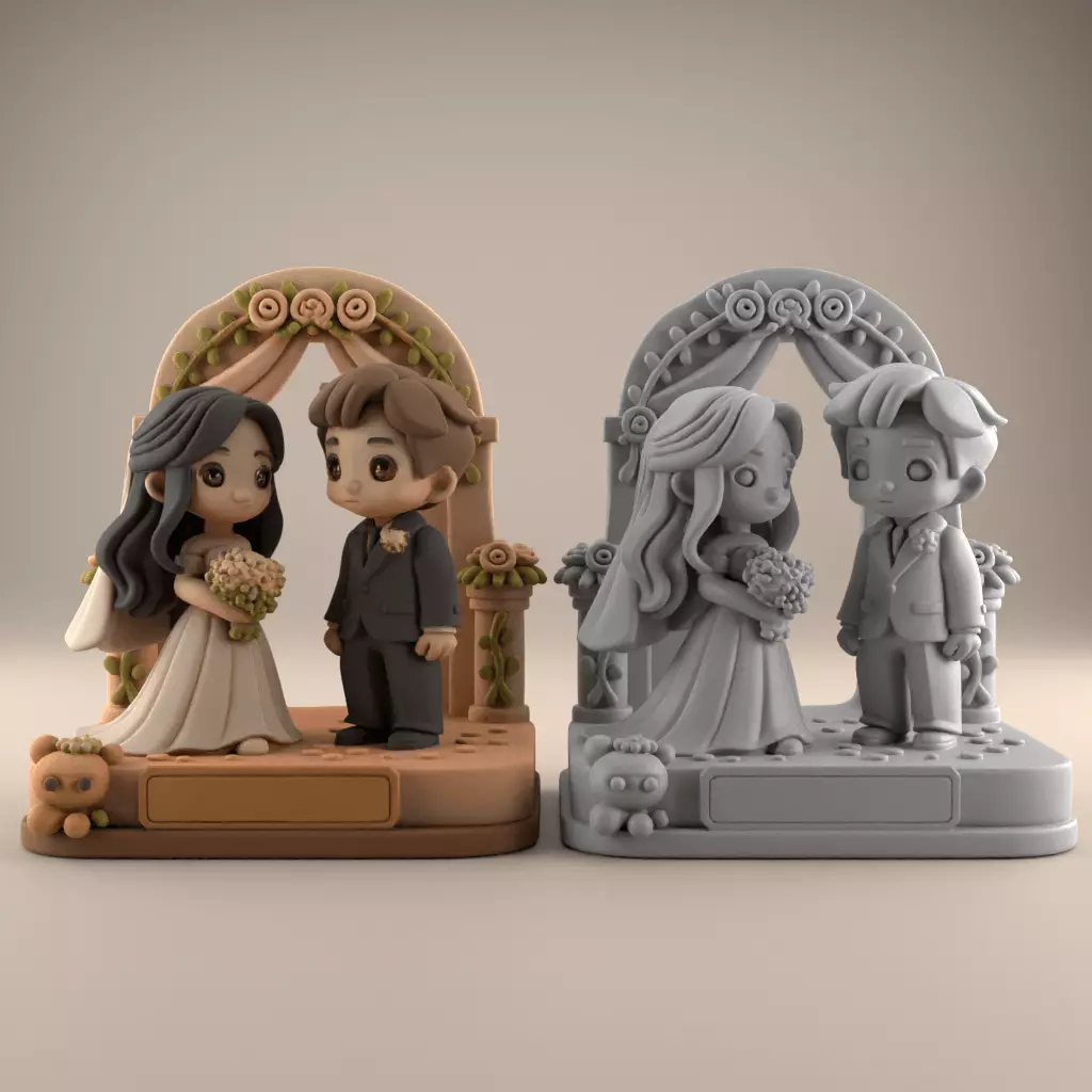 Design ConceptThis model features an adorable wedding couple standing under an ornate arch, with intricate details such as small floral arrangements and loving expressions. It's an ideal representation for a decorative piece or a cake topper for weddings.