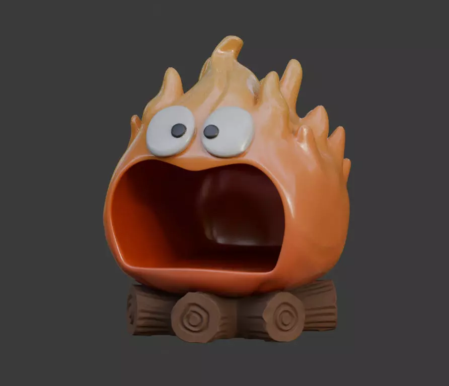 This is a fantasy container inspired by Calcifer, the iconic fire spirit from Howl’s Moving Castle.The model features a cute, expressive flame character sitting on wooden logs, with an open mouth that serves as a small container or holder — perfect for storing small items, candles, or as a unique desk decoration.