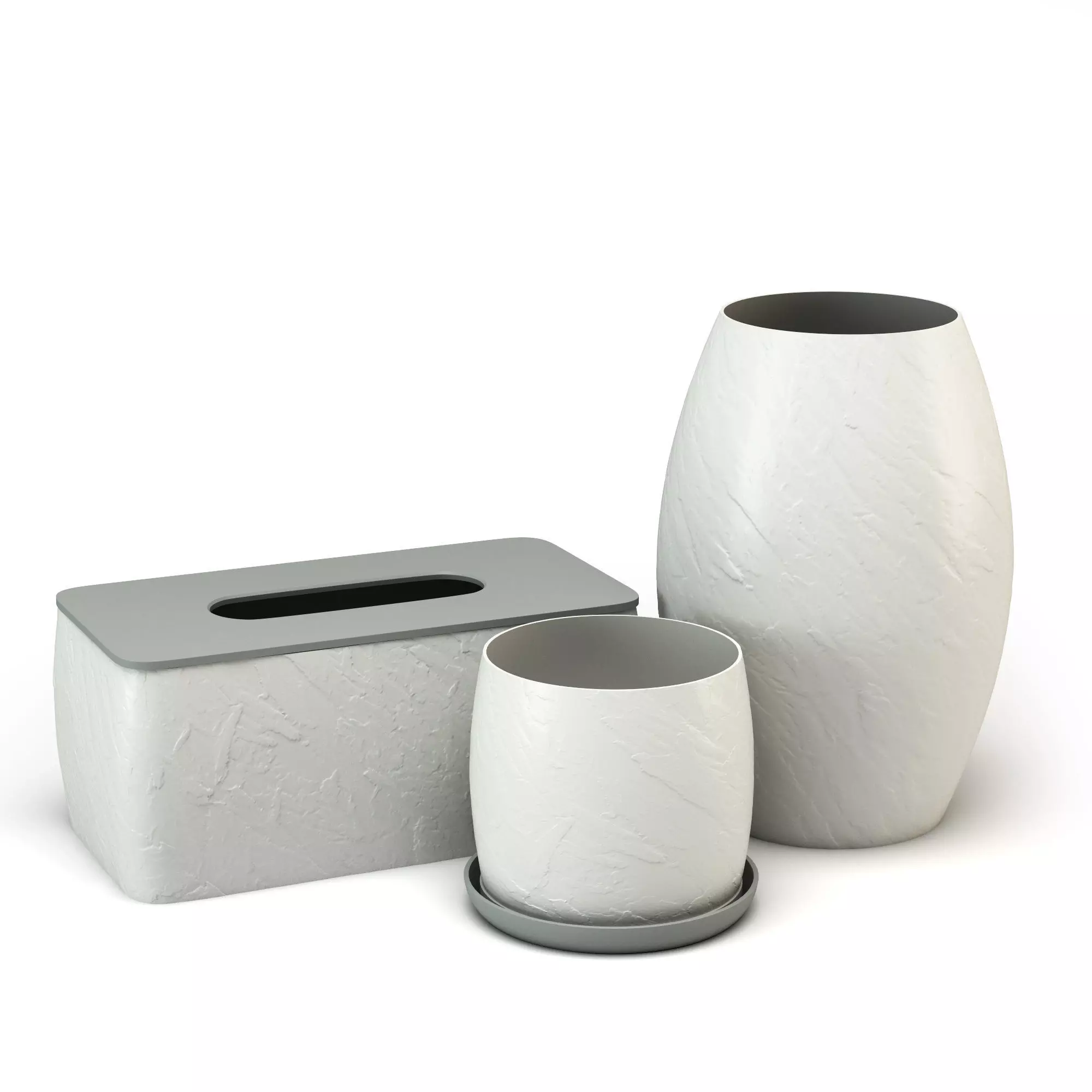 *Materials: *Designed for 3D printing with PLA or similar filaments (printer settings adjustable).*Design: *Textured, cracked surface for a natural, artisanal look.*Set Includes: *Paper towel dispenser with a sleek top slot.Tall vase with a wide opening.Small pot with an included saucer for plants.