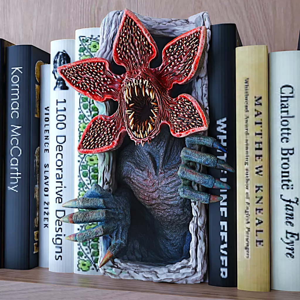 Bring the Upside Down straight into your bookshelf with this striking Demogorgon Book Nook, inspired by the iconic monster from the Netflix series Stranger Things.Designed to fit seamlessly between books, this piece creates the illusion of the Demogorgon breaking through another dimension, transforming any shelf into a cinematic scene.