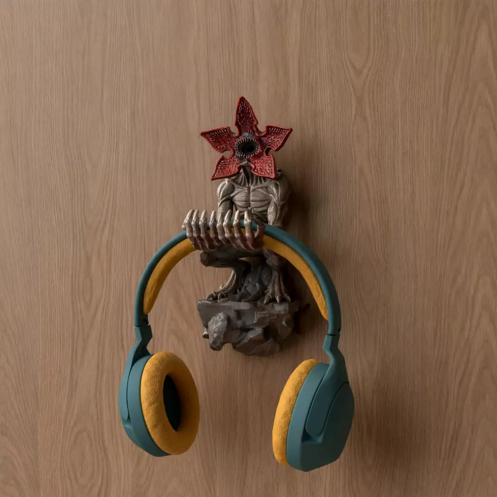 A dramatic 3D printable headphone holder featuring the Demogorgon from Stranger Things. This wall-mounted sculpture shows the iconic creature emerging from the surface, gripping your headset with its clawed hands, transforming your setup into a cinematic display.