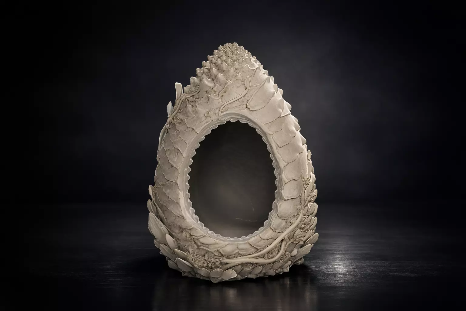Expertly 3D printed with high-quality filament, this fantasy egg sculpture showcases impressive detail from every angle. The sculpted scales wrap naturally around the egg form, while delicate ornamental elements add depth and character. Its hollow center creates a unique, eye-catching design that sets it apart from traditional Easter decorations.