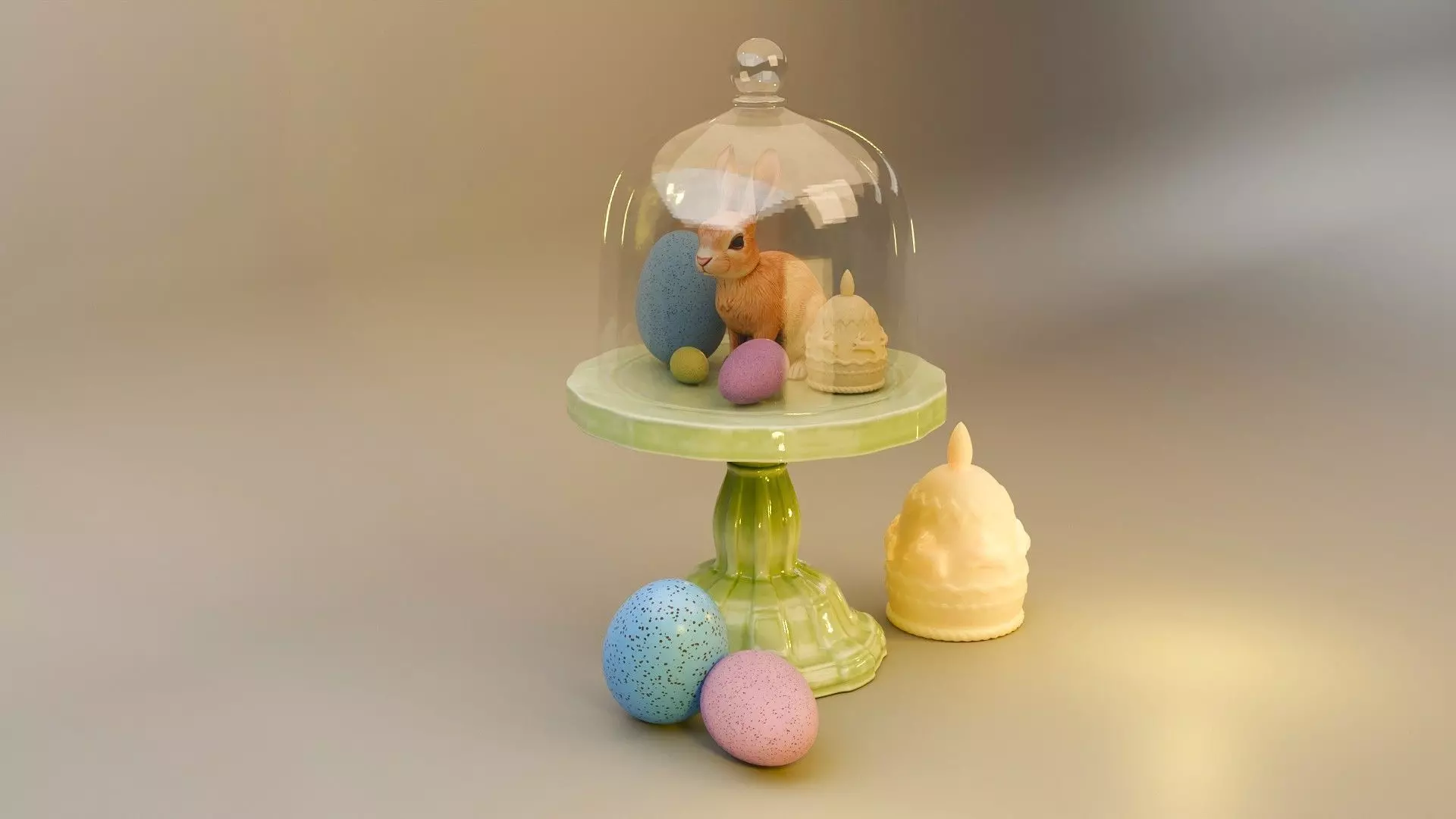 What’s Included (6 Objects):• 1 Decorative Pedestal Support• 2 Cloches (Glass Domes) – Hollowed version – Fully solid version• 1 Easter Bunny Figurine• 1 Egg-Shaped Easter Candle• 1 Decorative Easter Egg