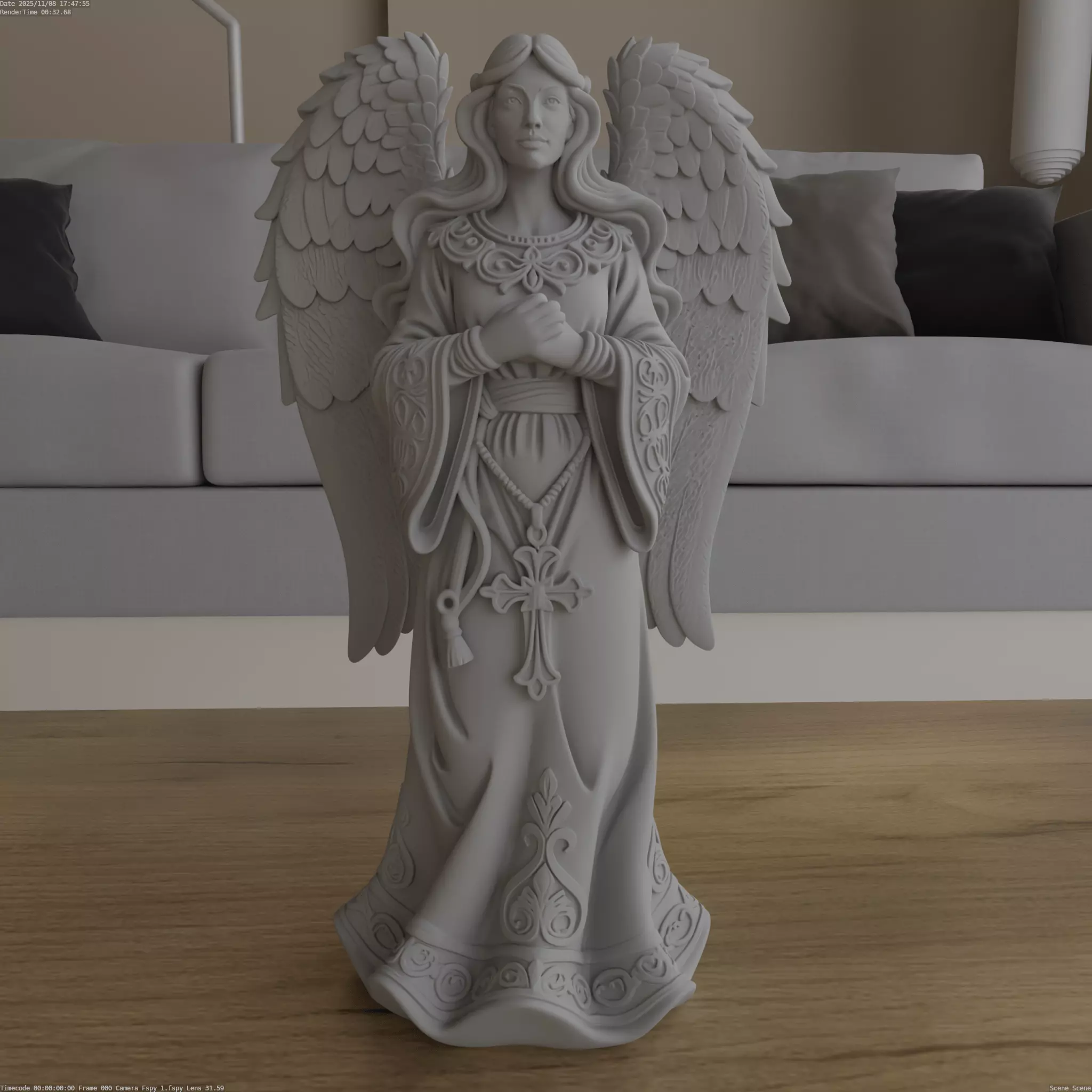 Design ConceptThis 3D model features an elegantly detailed Christmas angel, embodying serenity and grace. Intricate patterns adorn the robe and wings, enhancing its ethereal nature.