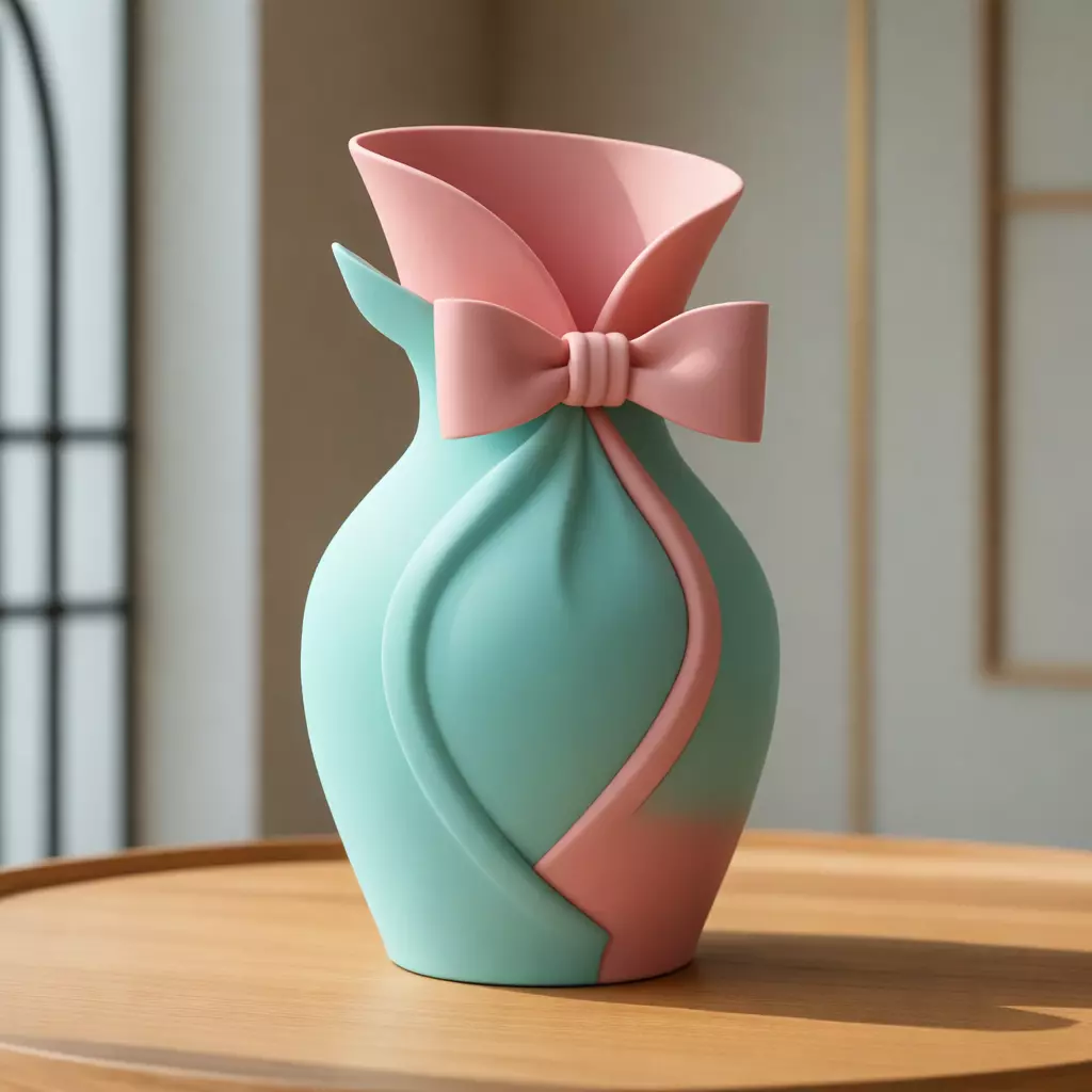 A modern and elegant decorative vase featuring a smooth, clean surface with a unique twisted ribbon design wrapping around the body. The model blends soft curves with a stylish bow detail, creating a sophisticated and eye-catching piece suitable for contemporary interiors.