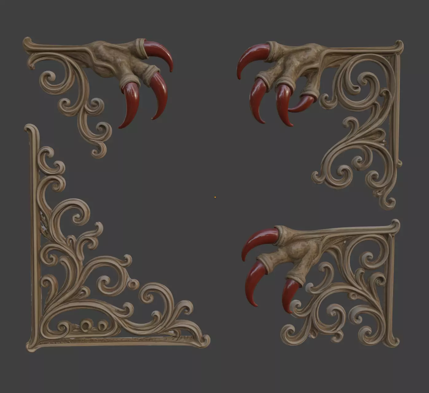 Add a touch of dark gothic elegance to your tomes, journals, or grimoires with these ornate book corners. Featuring swirling baroque filigree grasped by succubus-like talons with blood-red claws, they are perfect for transforming any book into a treasured relic of the arcane.
